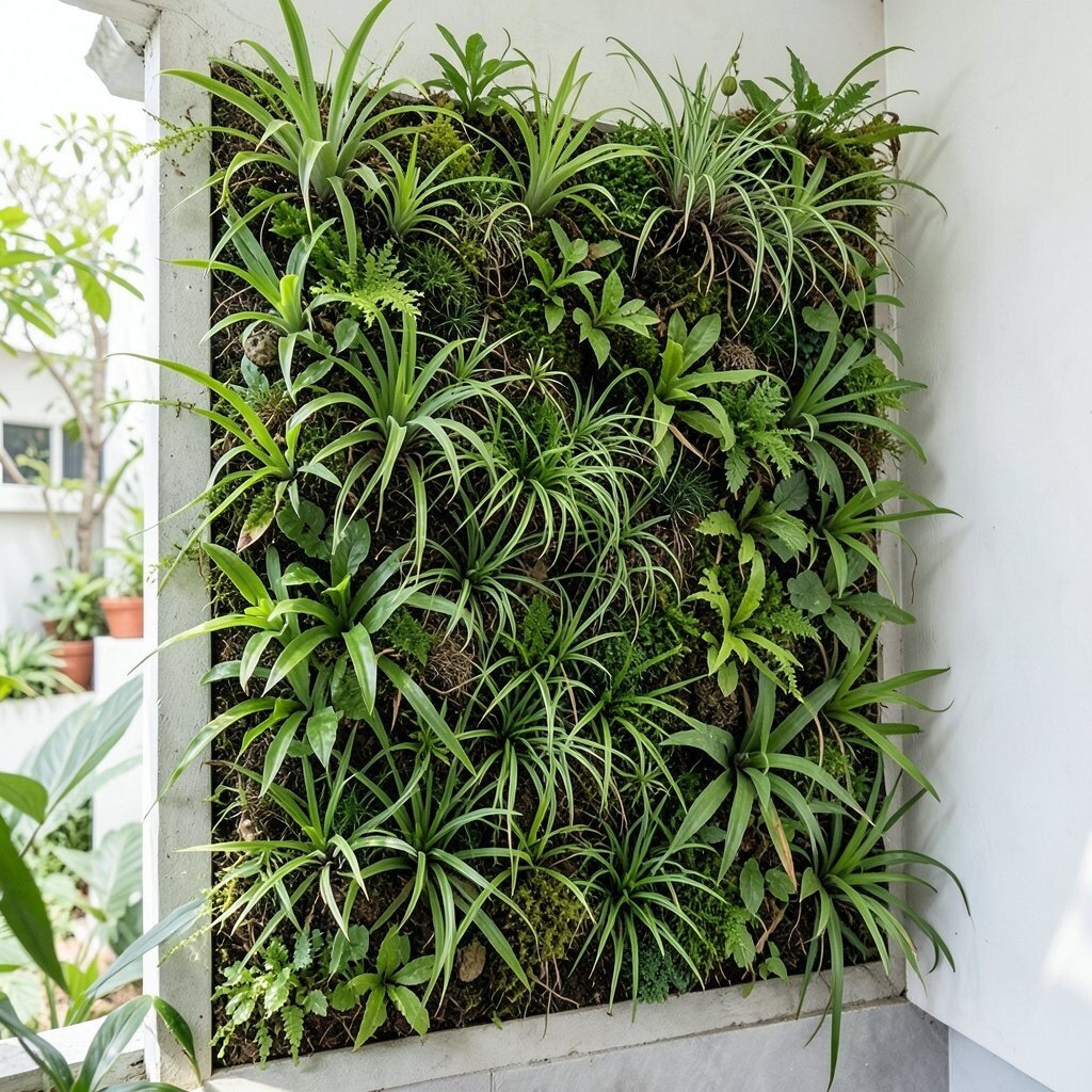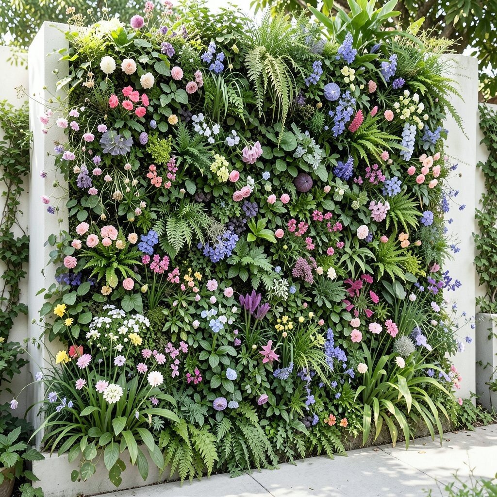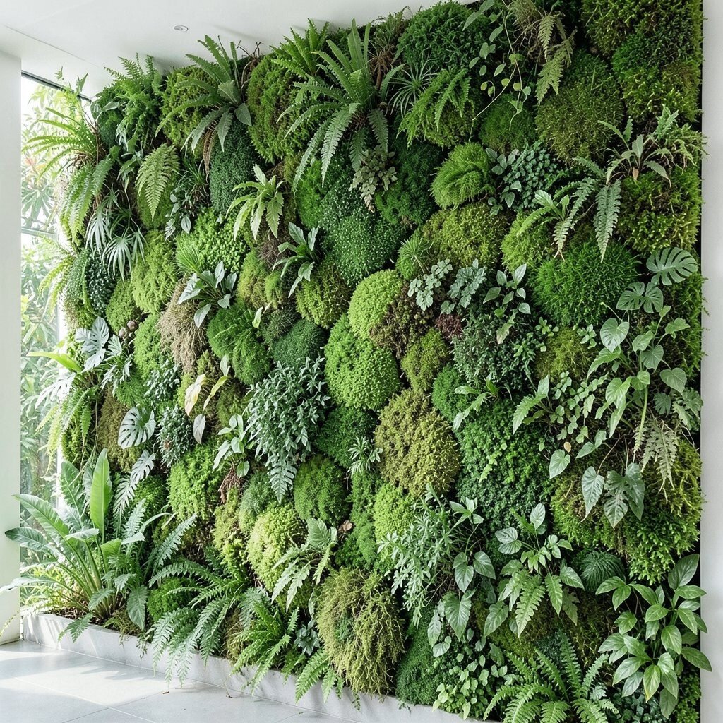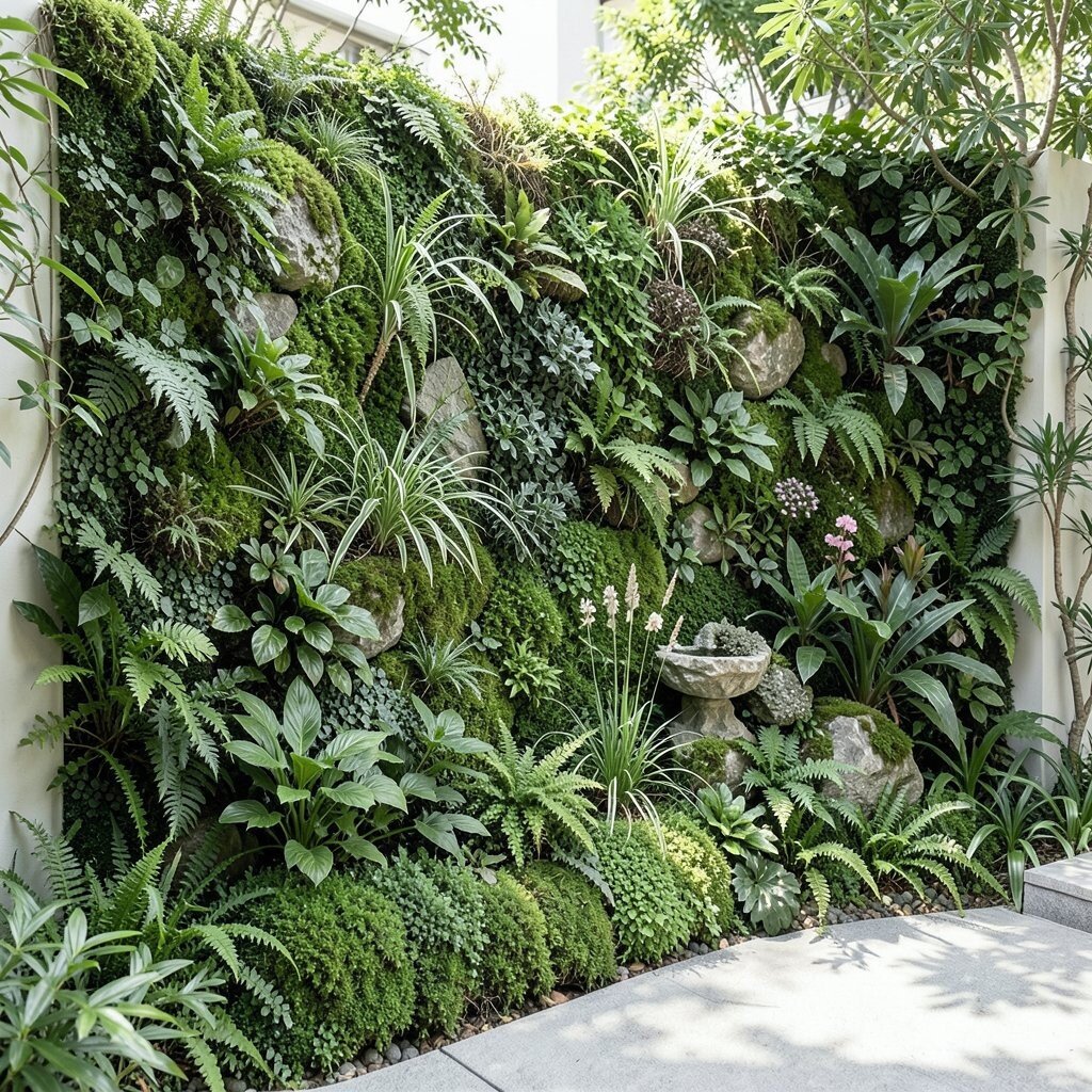 Create a lush paradise with a tropical vertical garden. Use plants like ferns, philodendrons, and bromeliads for a jungle effect.