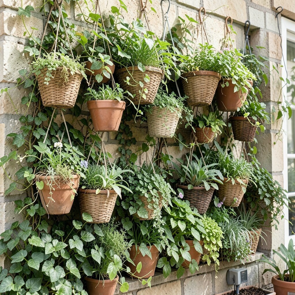 Hanging baskets are a versatile option for a living wall. Fill them with trailing plants like pothos or petunias.