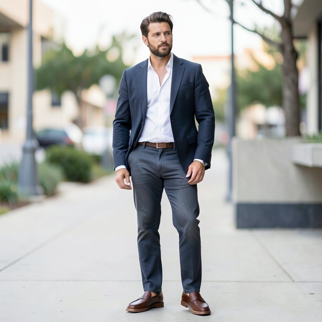 A blazer can make loafers feel smart right away, even with a simple tee. The dark tee keeps the outfit cool and modern instead of too formal.