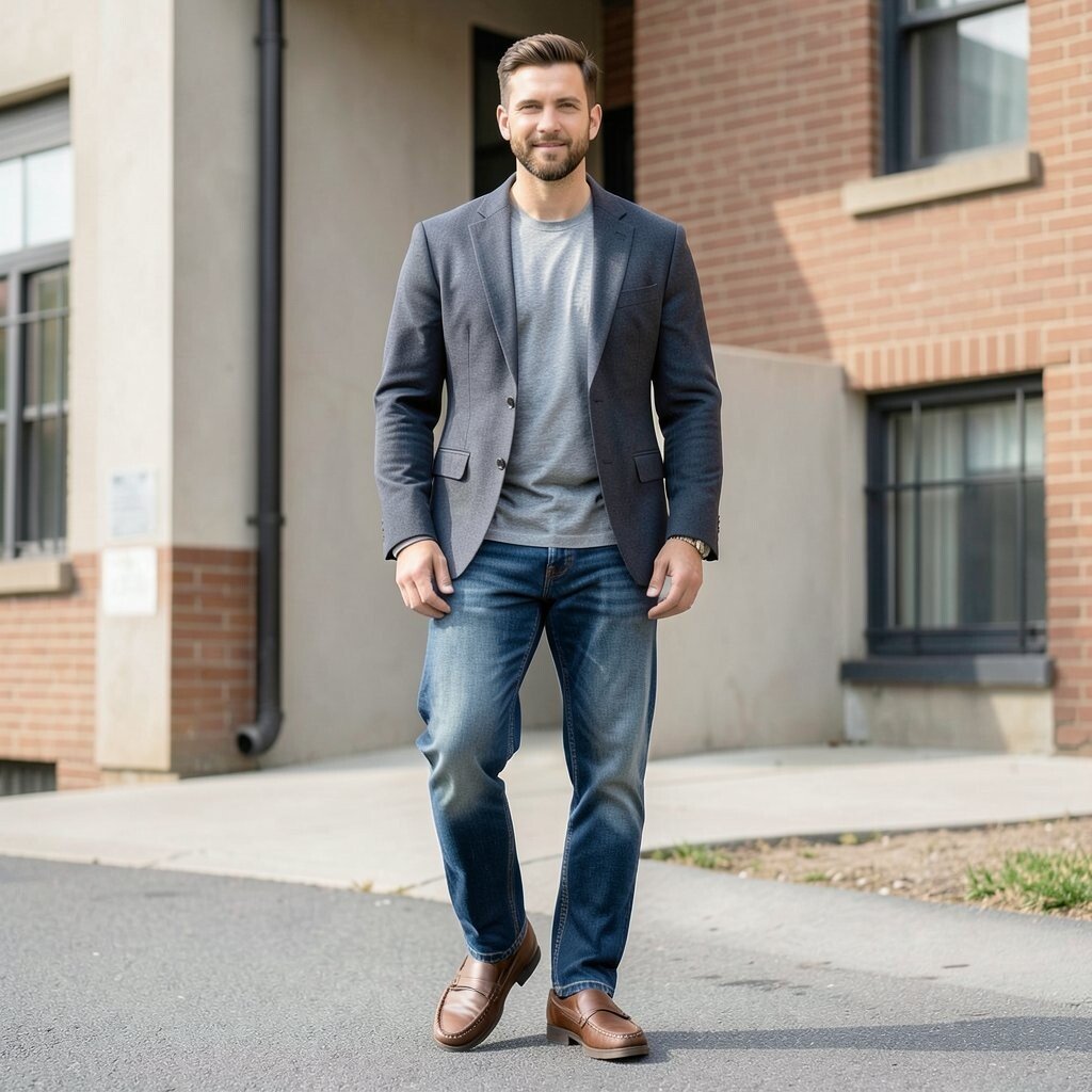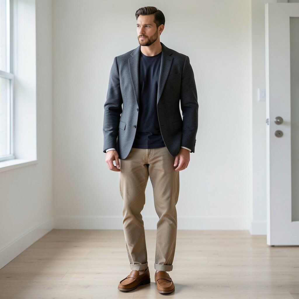 This outfit is a classic because it mixes dressy and casual pieces so well. The tee keeps it easy, while the blazer and loafers add polish.