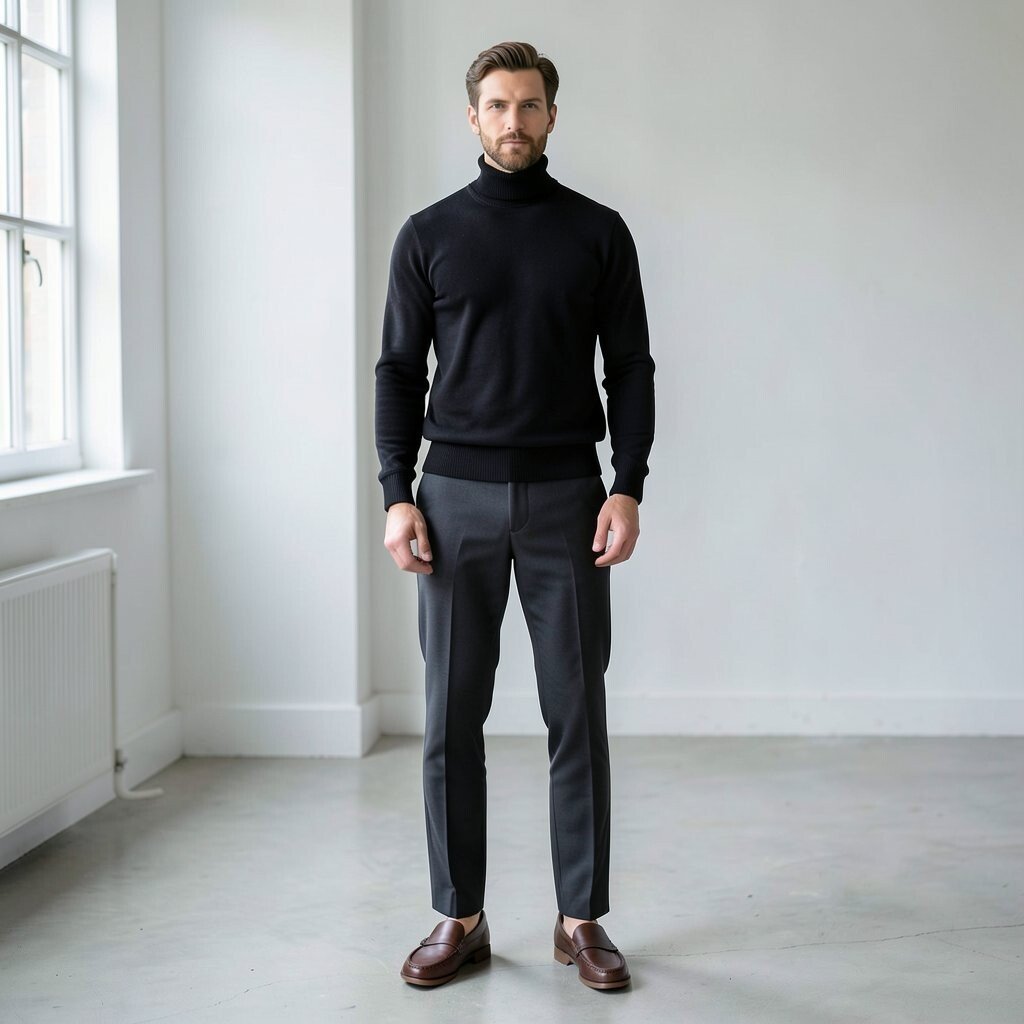 This outfit has a cool, quiet style that feels modern and sleek. The turtleneck gives a smooth top half, while straight pants keep the shape balanced.