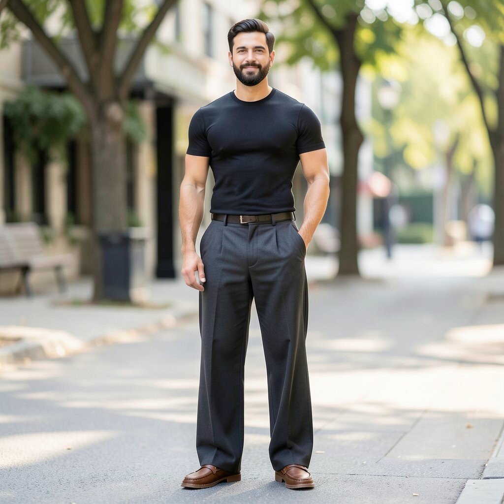Pleated trousers bring a classic touch that pairs well with loafers. A tucked tee keeps the outfit easy and helps the trousers stay the main focus.