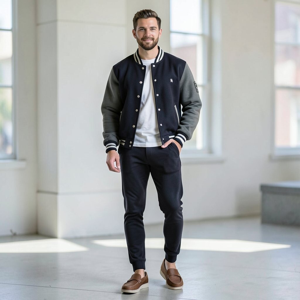 A varsity jacket gives the outfit a youthful edge, while loafers make it feel more grown-up. Slim joggers keep the look comfortable without making it too sporty.