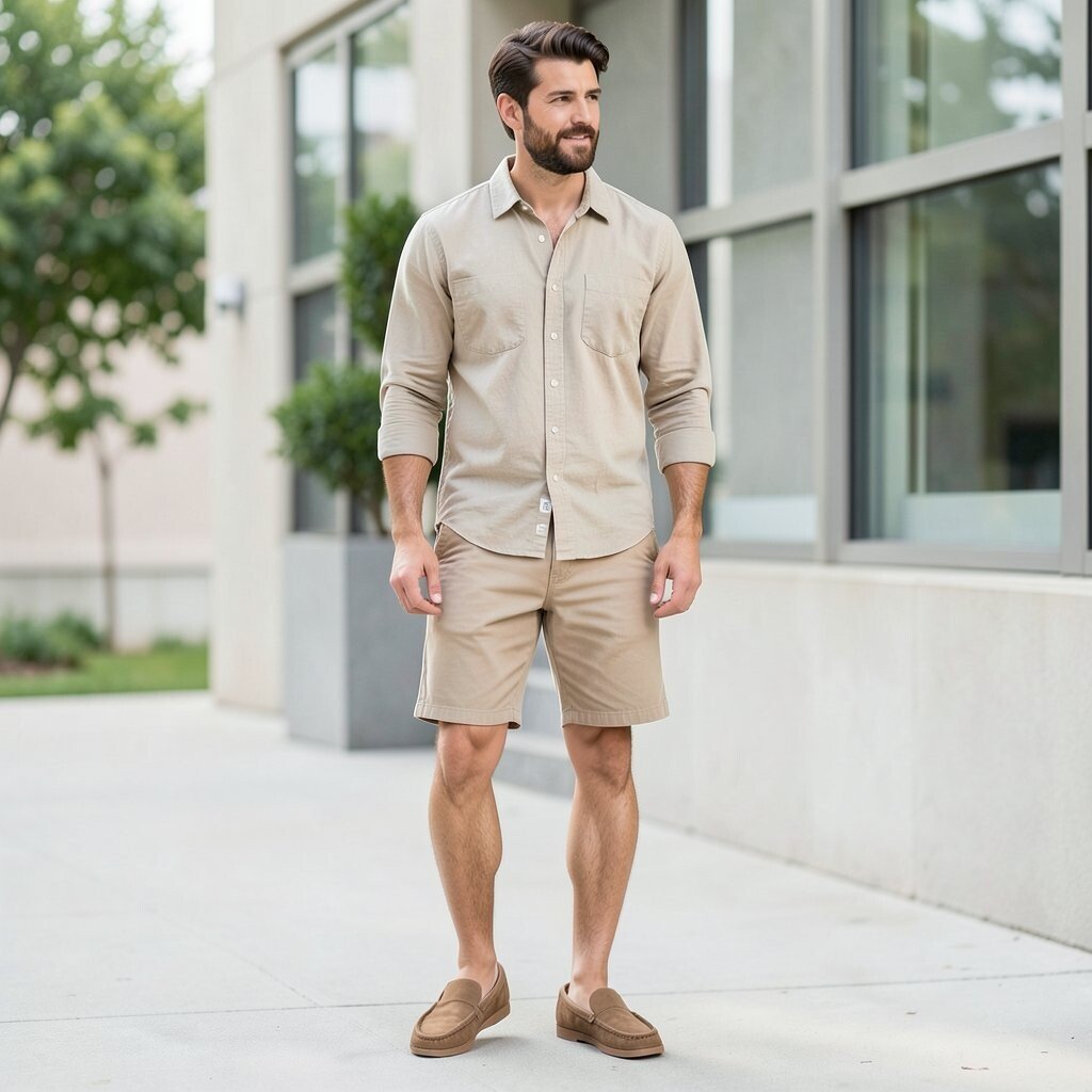 This outfit has a vintage feel that looks fresh again right now. Pleated shorts give structure, and the short-sleeve shirt keeps things breezy.