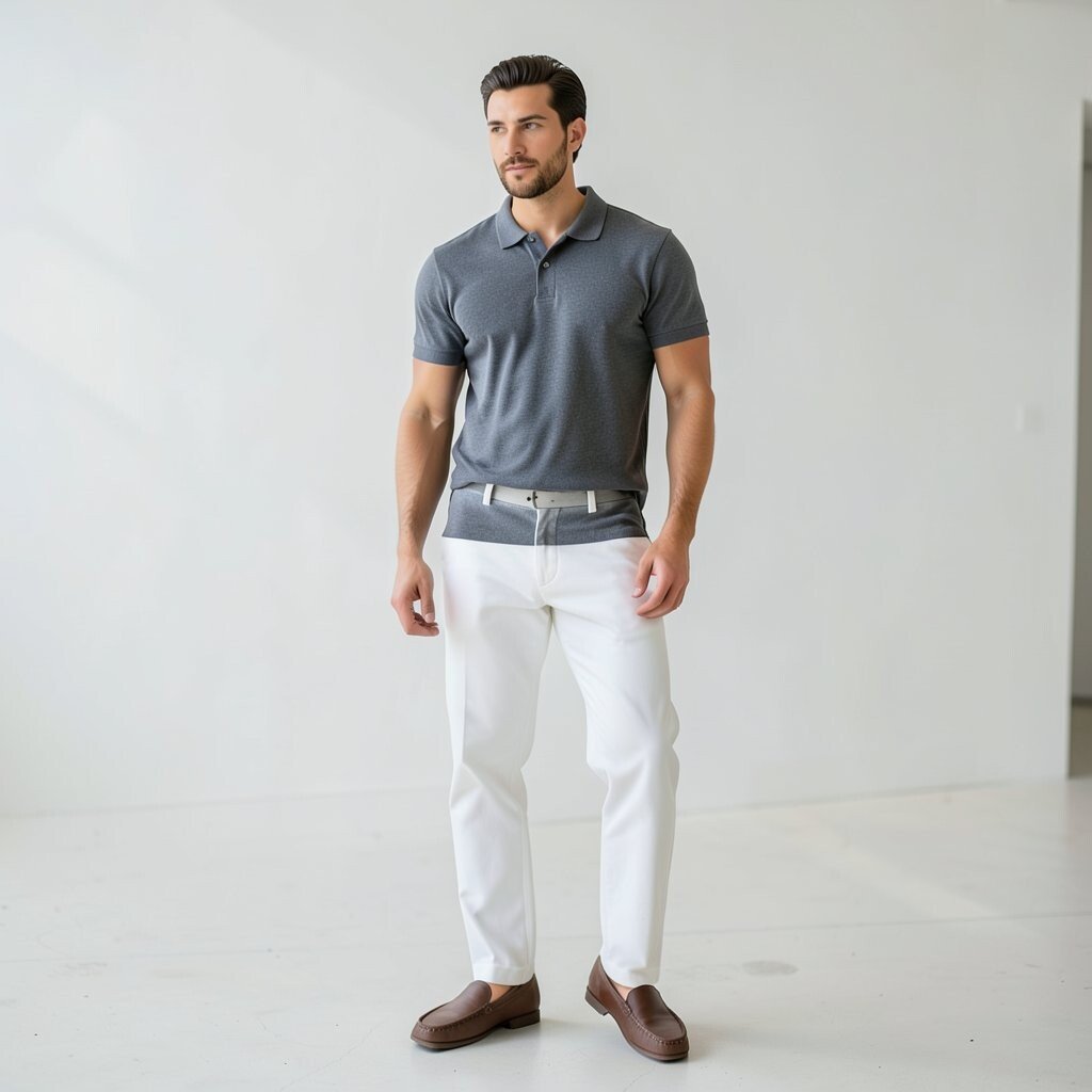 White pants make loafers pop and give the outfit a fresh feel. A polo shirt adds a sporty touch that keeps the style relaxed.