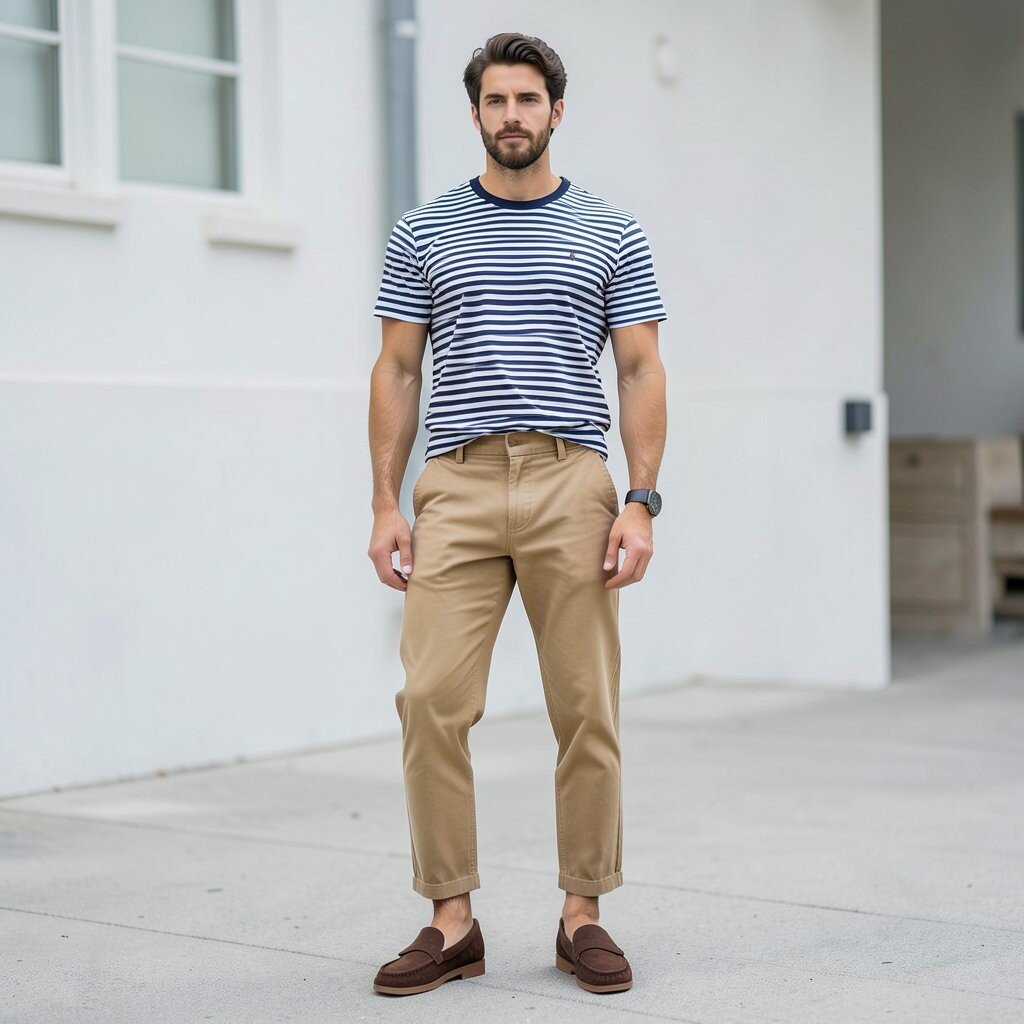 Cropped chinos show off the shoe and make the outfit feel light. A striped tee adds a fun, laid-back feel that still looks planned.