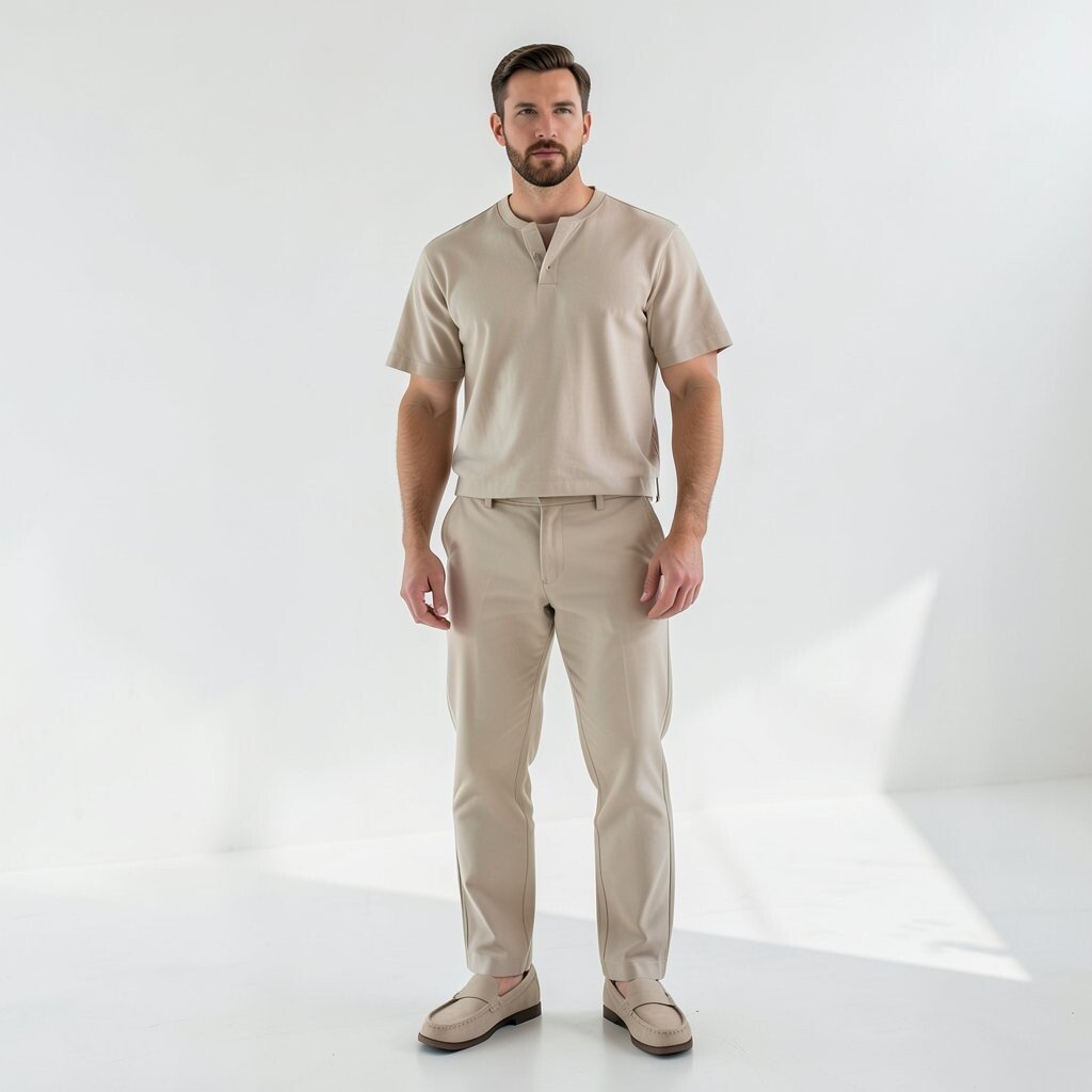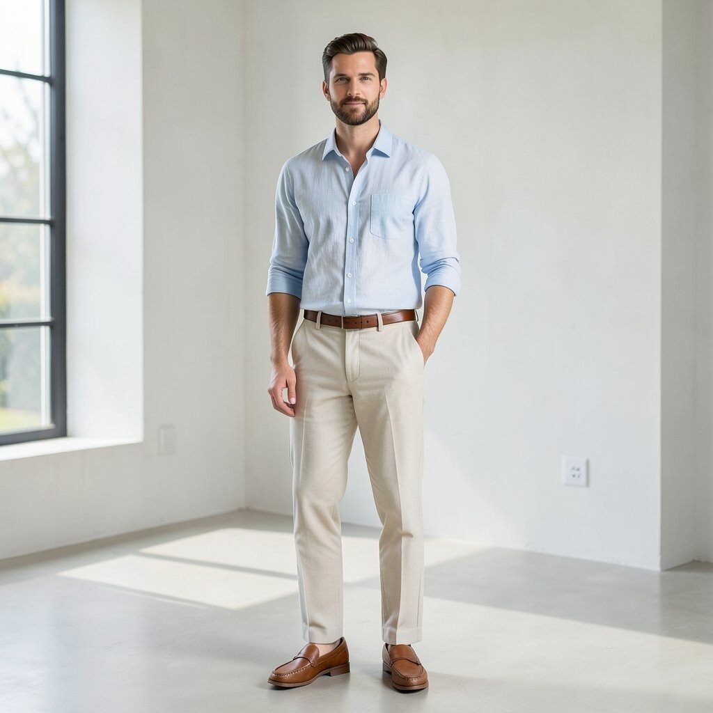 Light trousers in cream or beige make the whole outfit feel calm and fresh. Suede loafers often look great here because they match the relaxed feel.