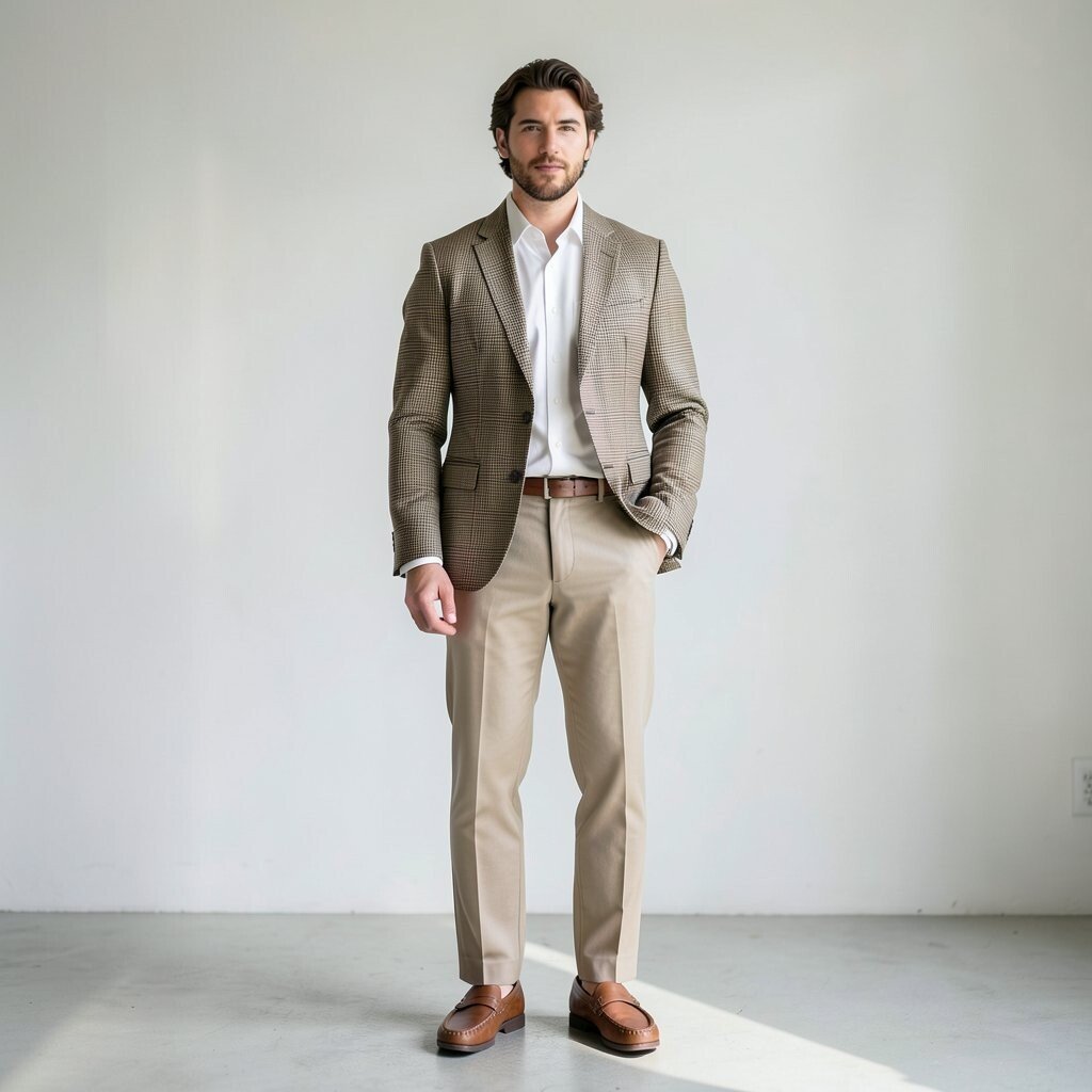 A checked blazer adds pattern and makes the outfit feel rich. Plain trousers keep the focus on the blazer and loafers, which gives the look balance.