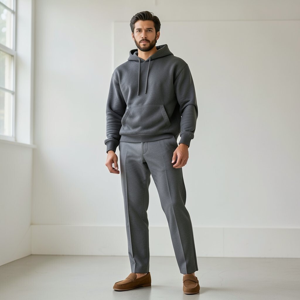 This mix blends comfort and style in a way that feels very current. The hoodie makes the look casual, while loafers add a smart twist.