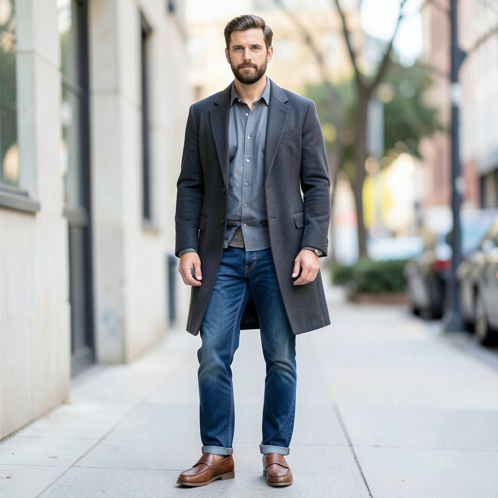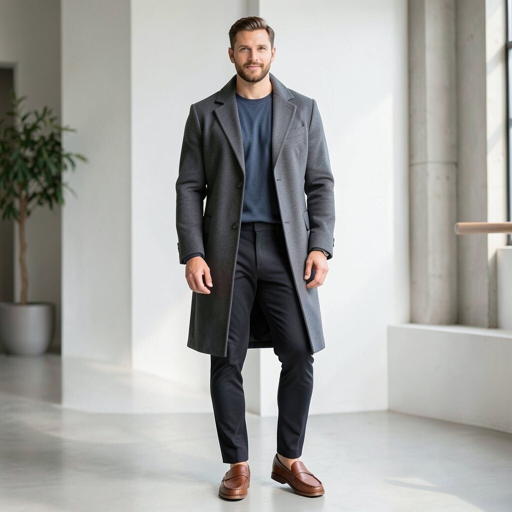 A smart overcoat makes loafers look elegant right away. Layered basics underneath keep the outfit easy to wear and help the coat feel less heavy.