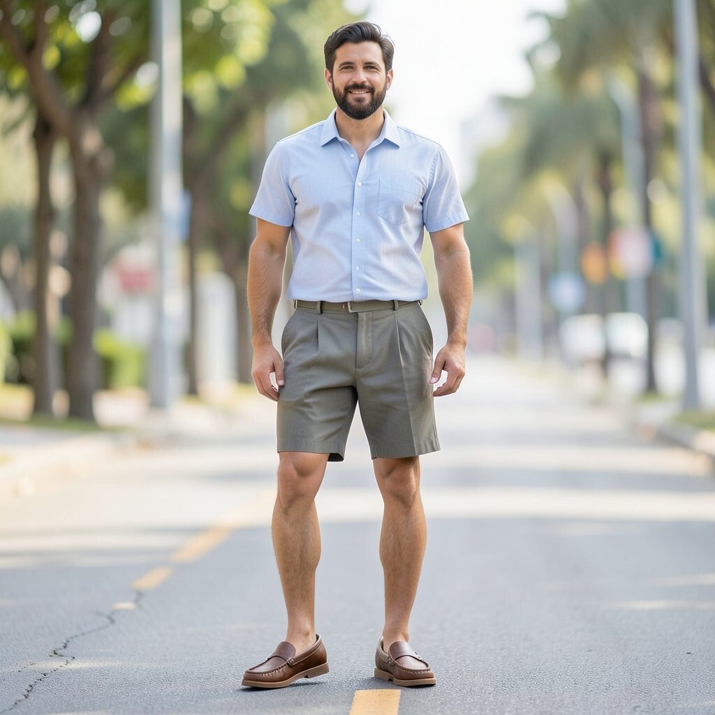 27. Loafers with a short-sleeve button-up and pleated shorts