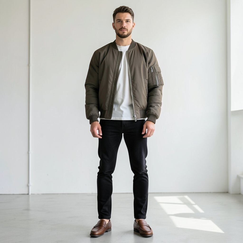 A bomber jacket gives the outfit a cool edge that works well with loafers. Black jeans make the look feel smooth and help the shoes stand out.