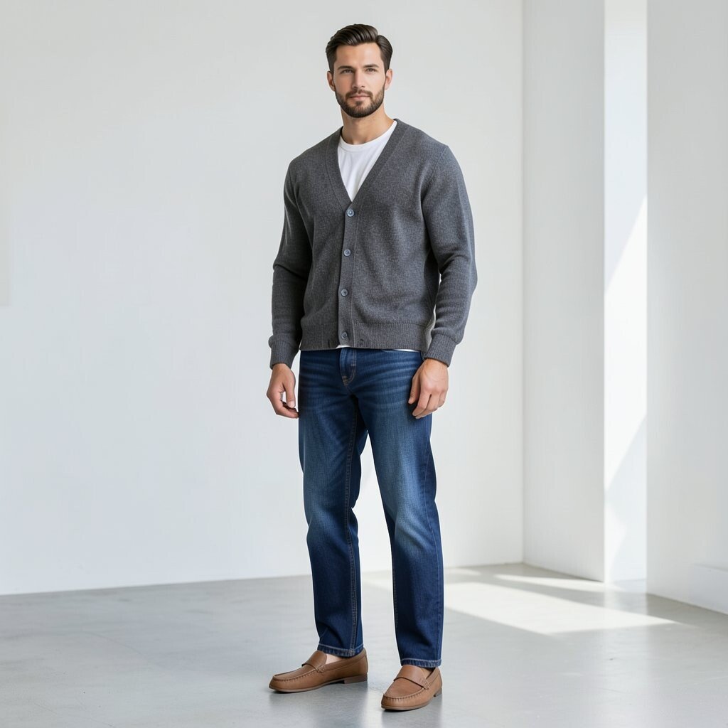 You can wear a tee, a henley, or a button-up under the cardigan. Each choice changes the mood a little, so it is easy to make the outfit feel like yours.