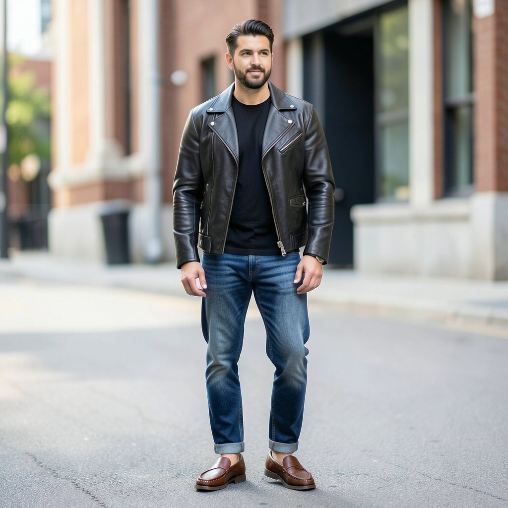 A leather jacket gives instant attitude and makes loafers feel cool. The black tee keeps the outfit simple so the jacket and shoes can stand out.