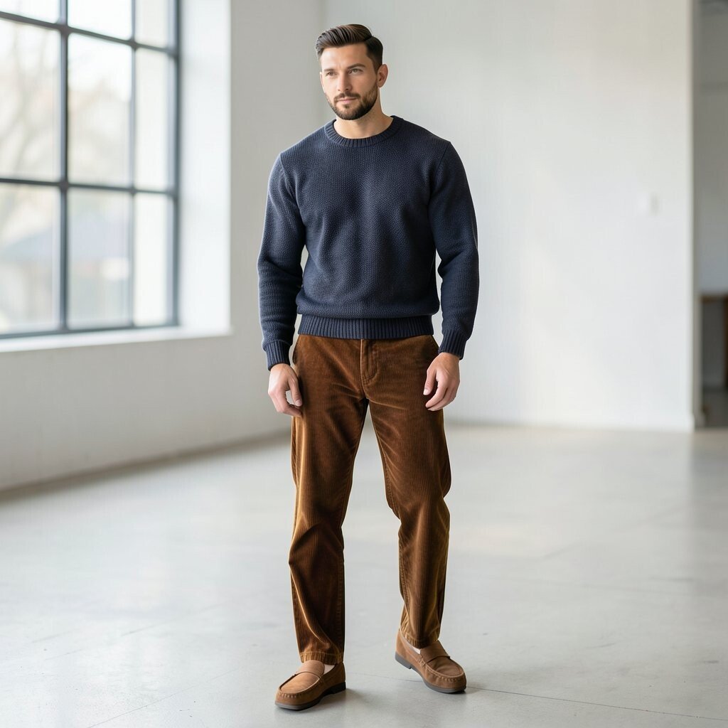 Corduroy gives the outfit a soft, rich texture that looks great with loafers. A sweater keeps things warm and easy, which makes this a strong fall choice.