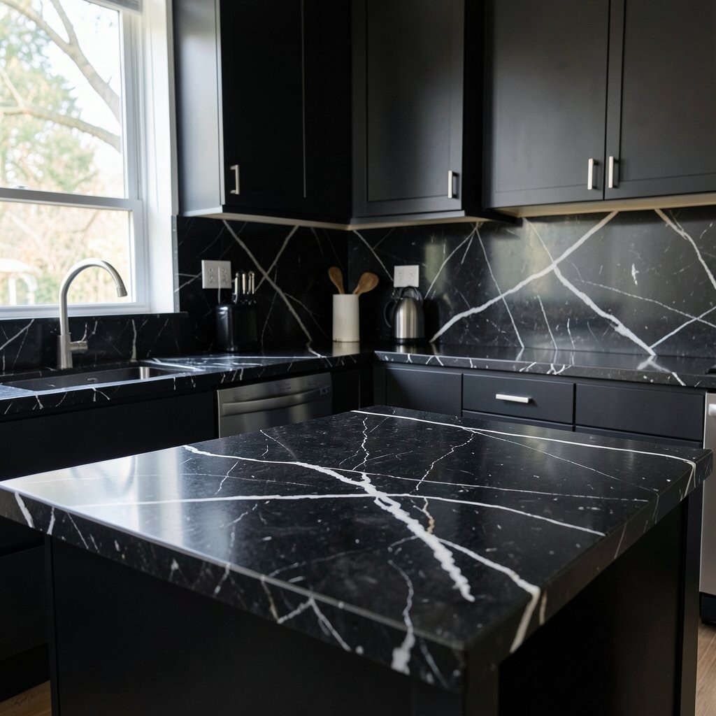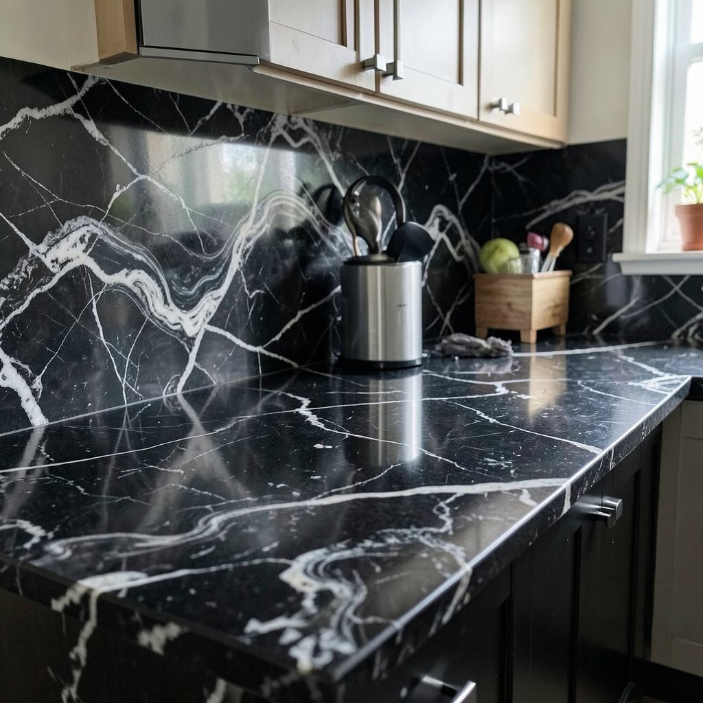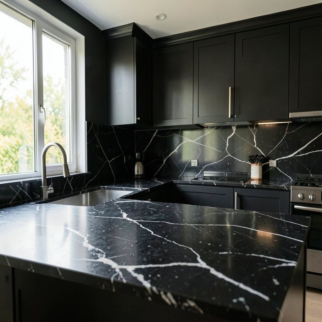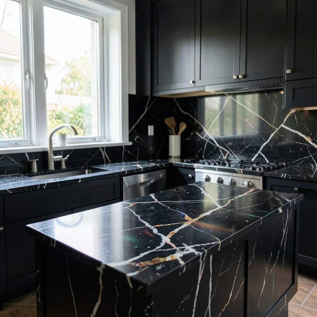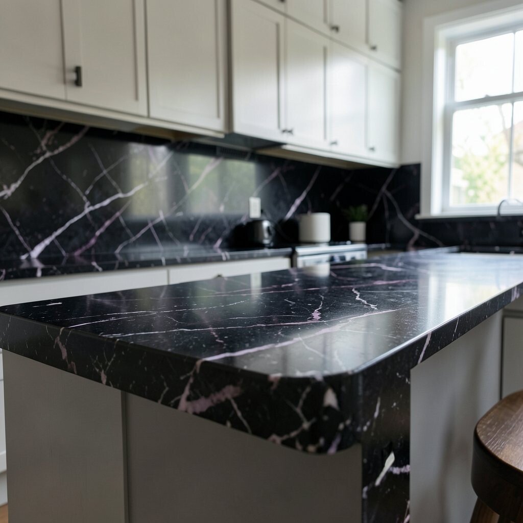 For a romantic touch, black marble with subtle pink veins is perfect. It’s soft, inviting, and adds a hint of romance to the kitchen.