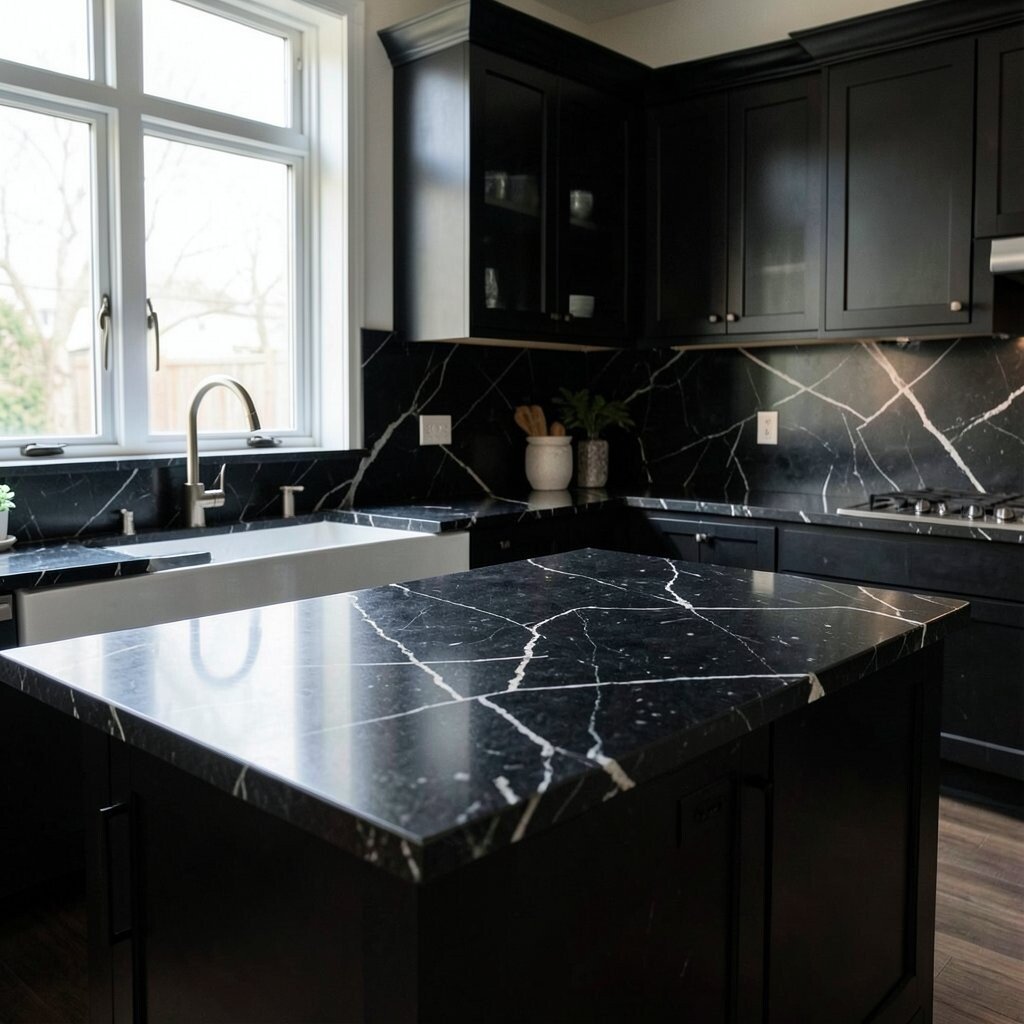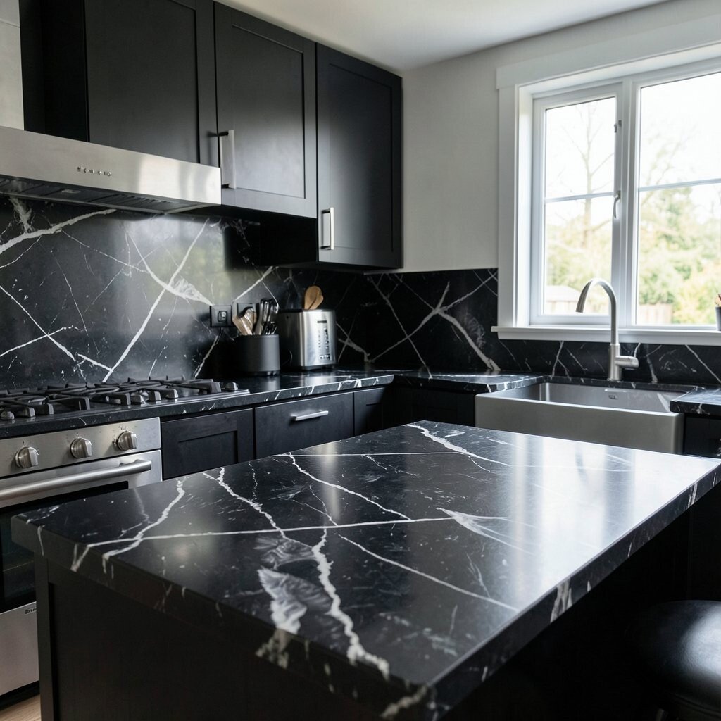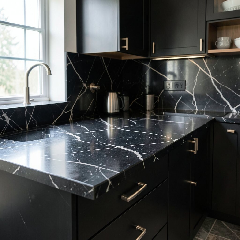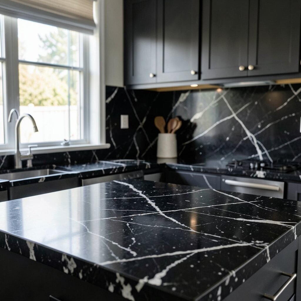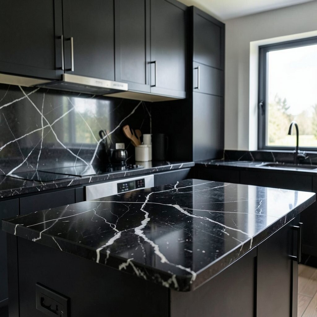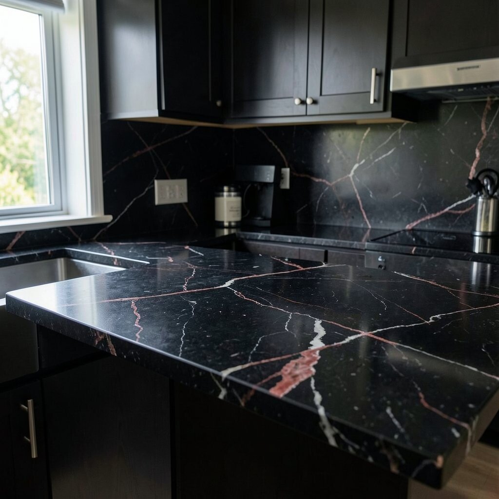 For a romantic touch, black marble with subtle pink veins is perfect. It’s soft, inviting, and adds a hint of romance to the kitchen.