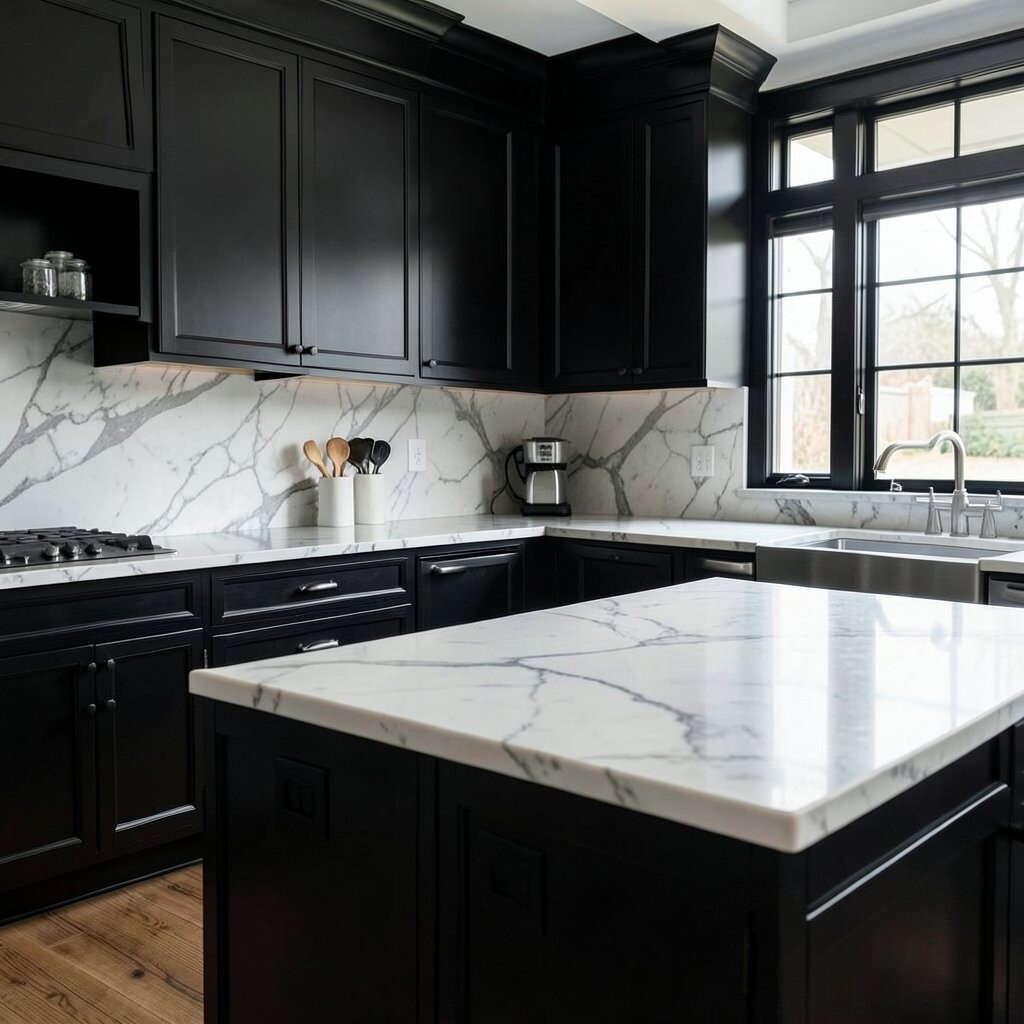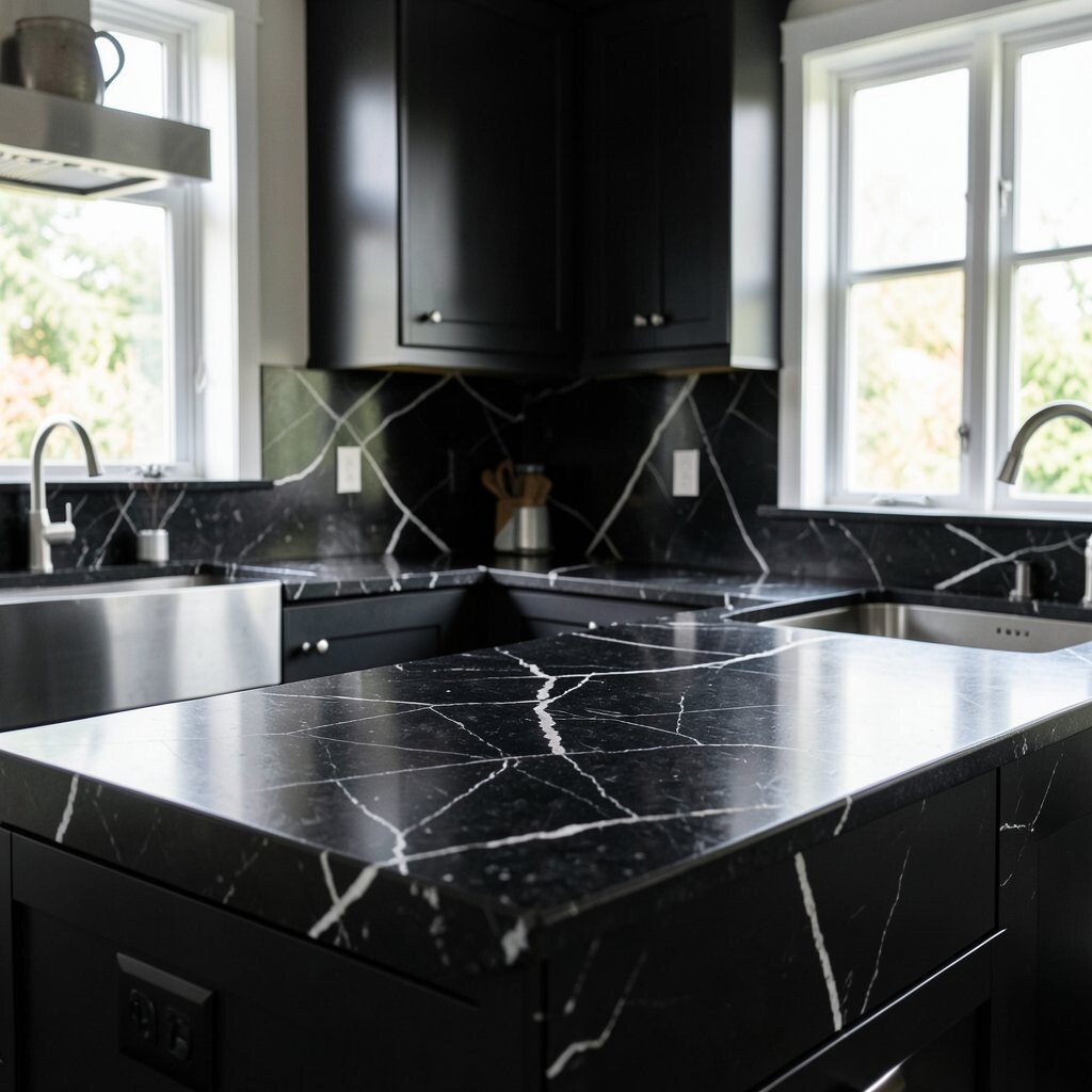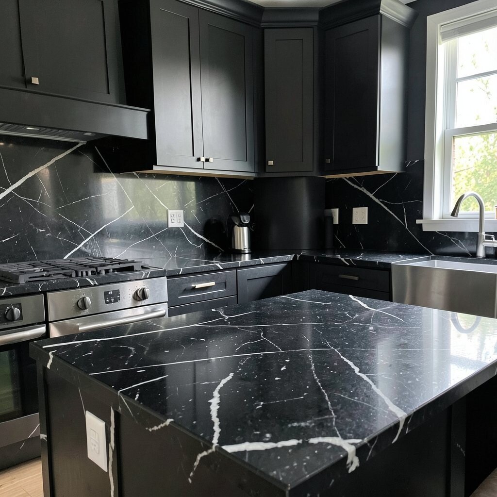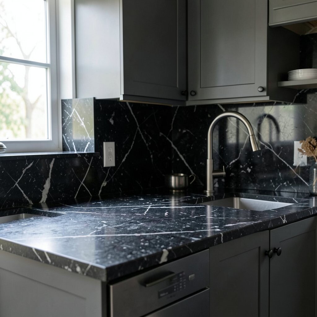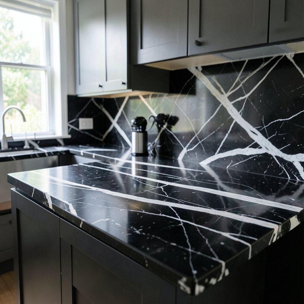 For a romantic touch, black marble with subtle pink veins is perfect. It’s soft, inviting, and adds a hint of romance to the kitchen.