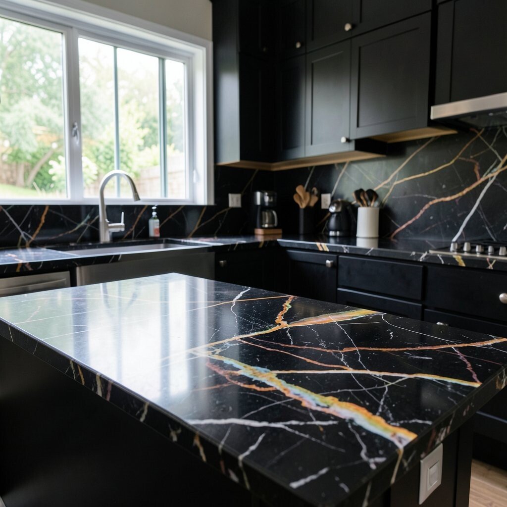 For something truly unique, consider black marble with rainbow veins. It’s like having a rainbow in your kitchen, adding joy and color.