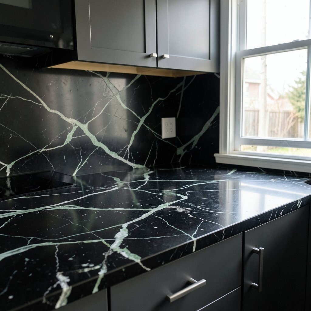 Subtle green hues in black marble add a natural, earthy touch. It’s calming and grounding, perfect for a kitchen oasis.