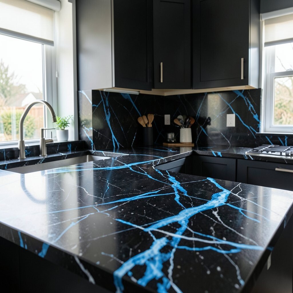 For a bit of magic, iridescent patterns in black marble can add a mystical touch. It’s like having a bit of stardust in your kitchen.