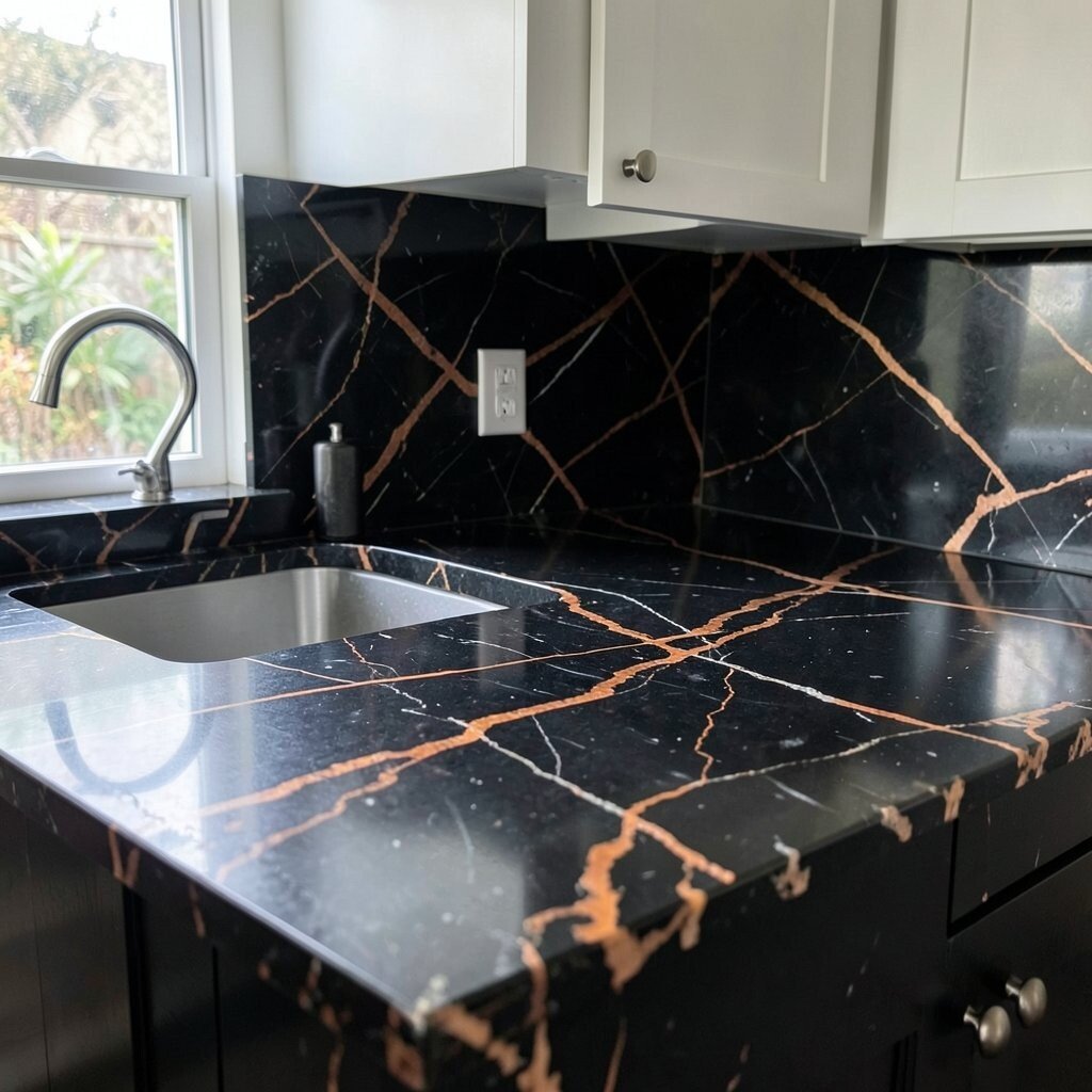 Copper veins in black marble add warmth and richness. It’s a unique combination that feels both modern and classic.