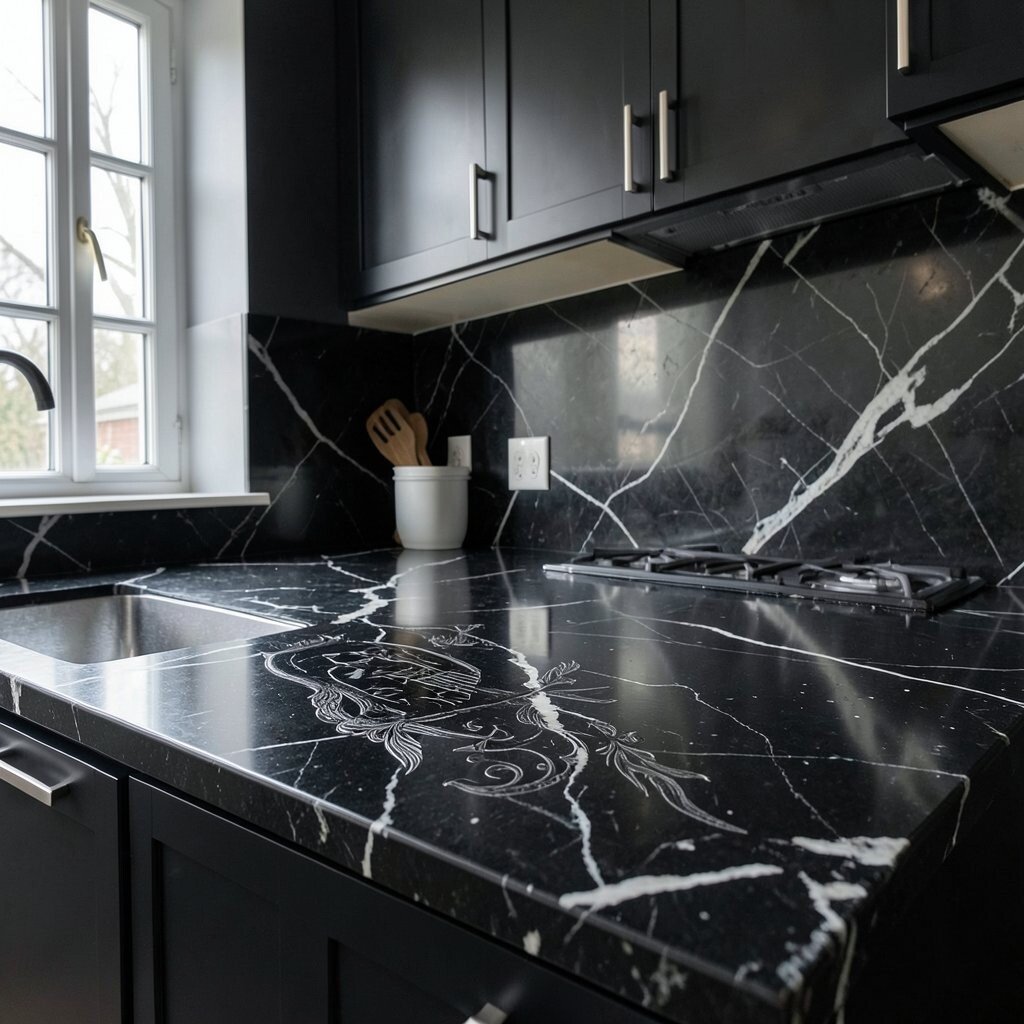 Imagine black marble with delicate botanical patterns. It’s like having a piece of nature in your kitchen.