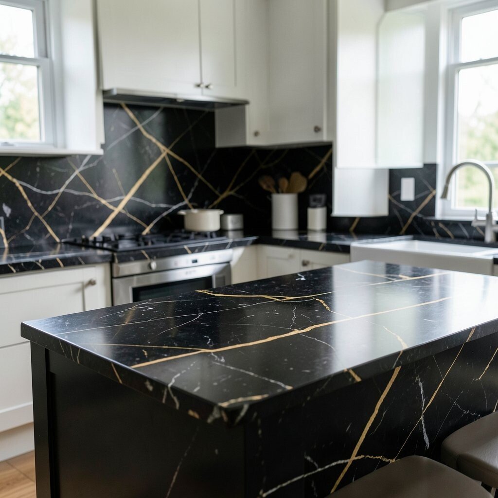 Imagine black marble streaked with shimmering gold veins. It’s like having a piece of art in your kitchen. This style is for those who love a touch of luxury.