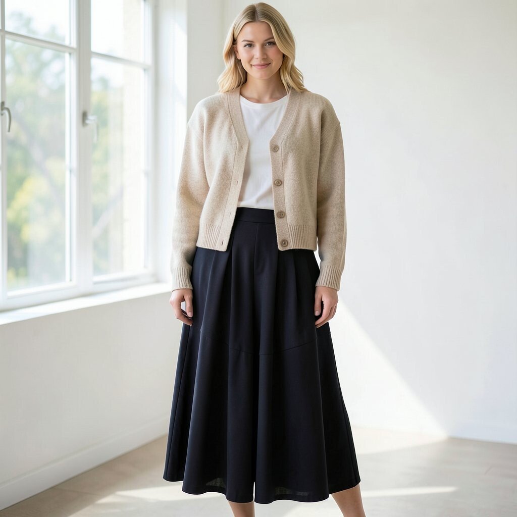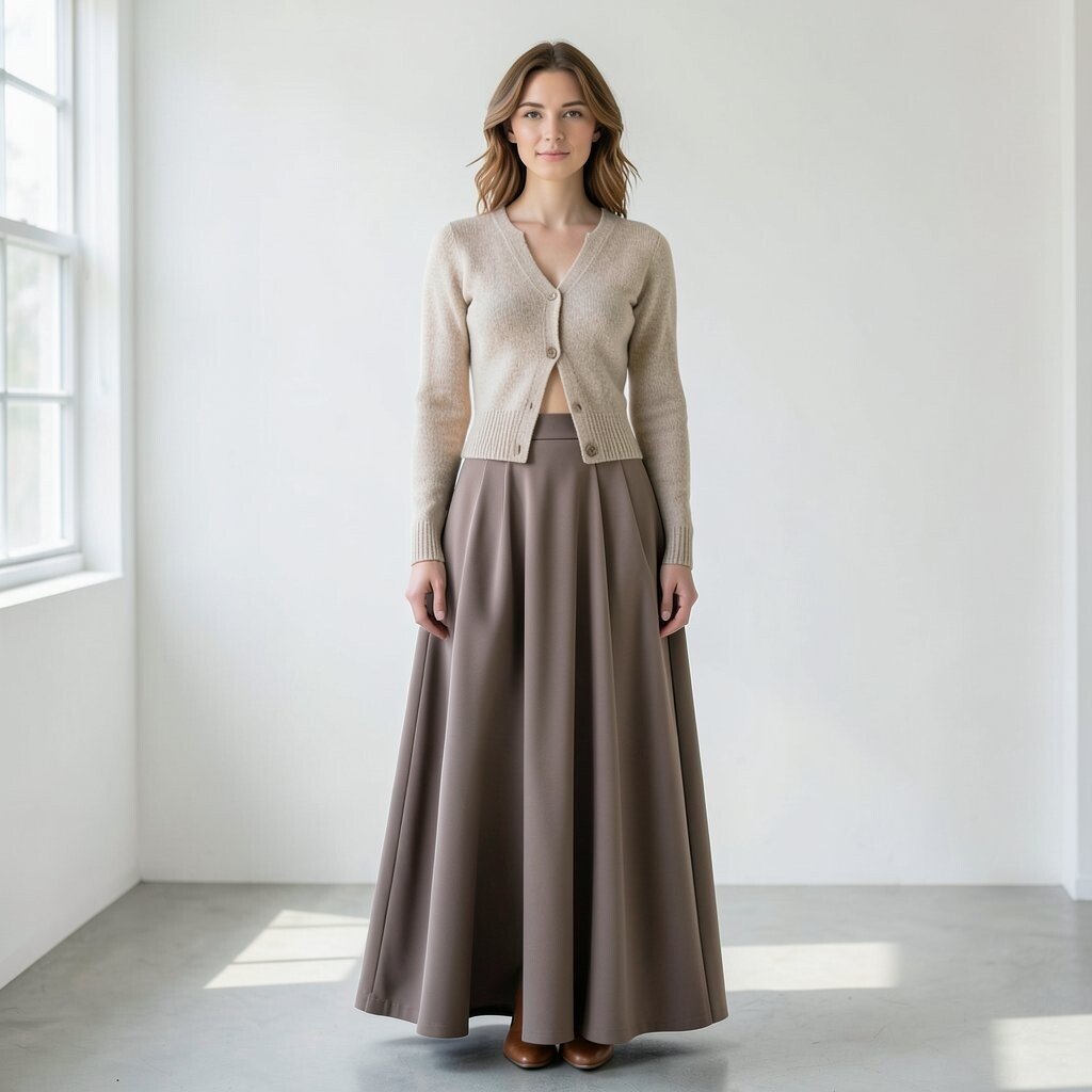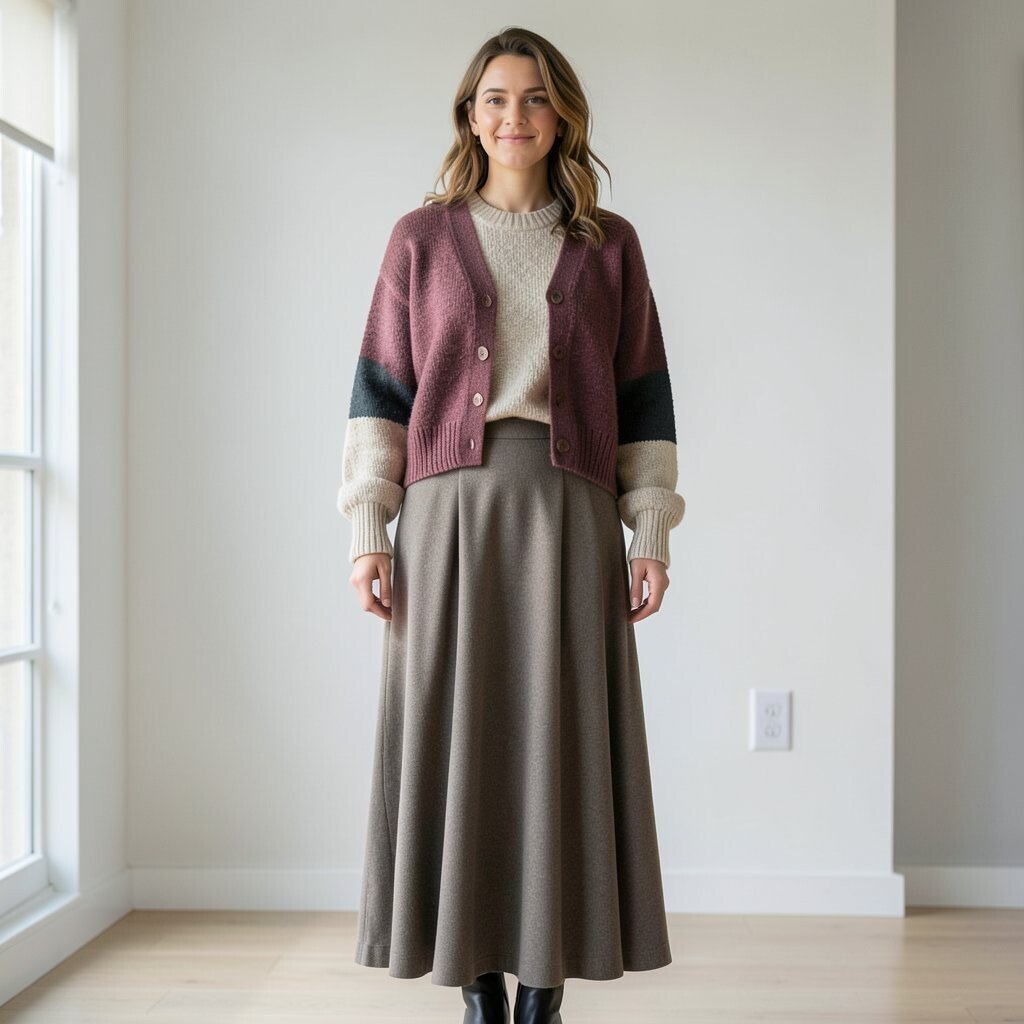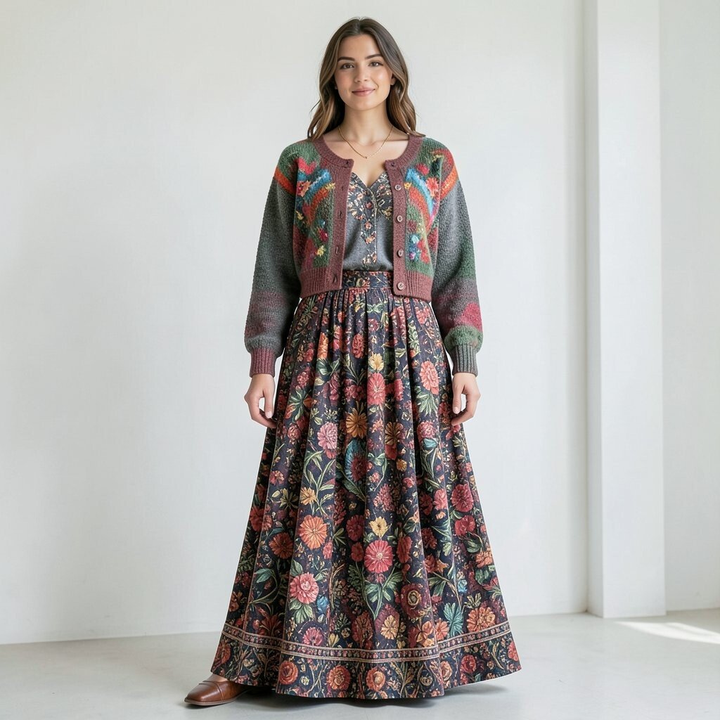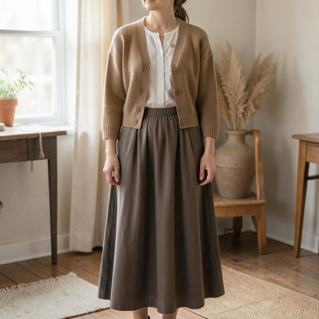 An earthy-toned maxi skirt with a textured cardigan brings warmth and depth to your outfit. Think shades of brown, rust, and olive for a grounded and natural look.