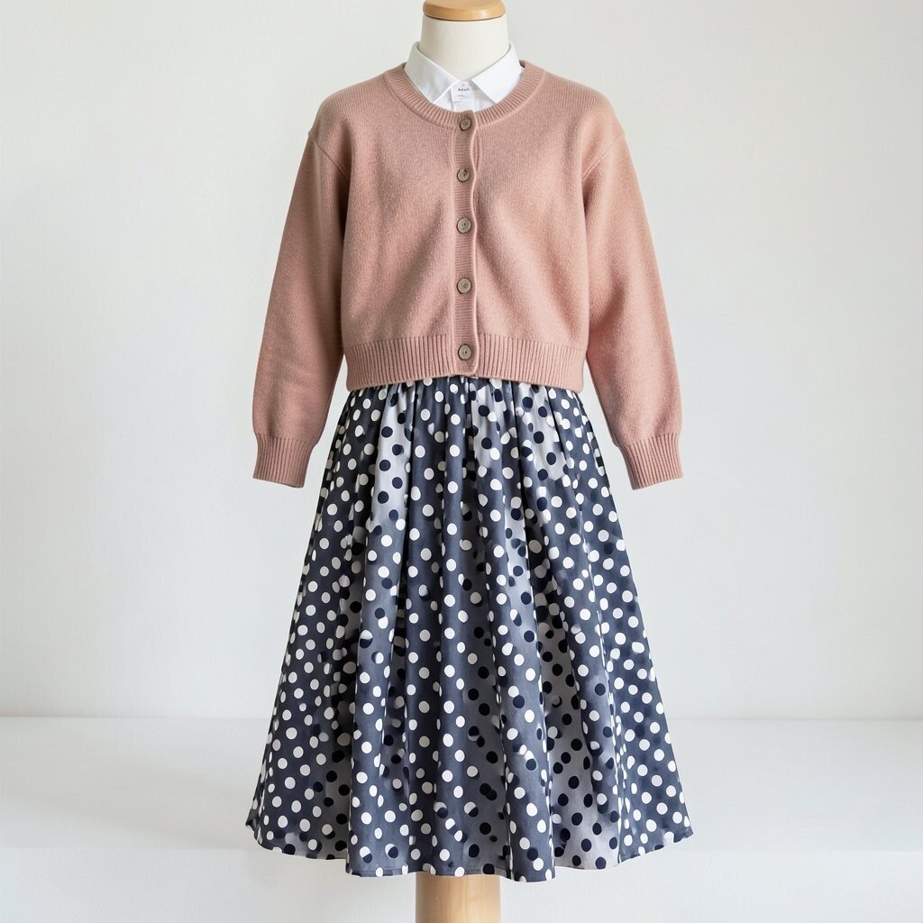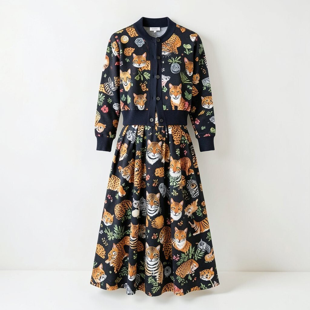 The abstract designs make a statement, while the cardigan tones it down just enough. It’s an outfit that stands out in any crowd, perfect for art shows or gallery openings.