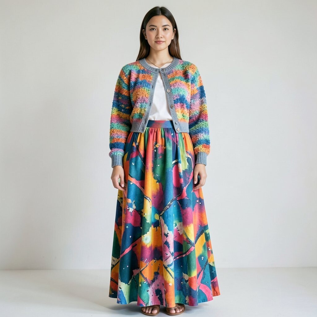 Get creative with an abstract-patterned maxi skirt and a solid-colored cardigan. This look is all about expressing your unique personality and style.