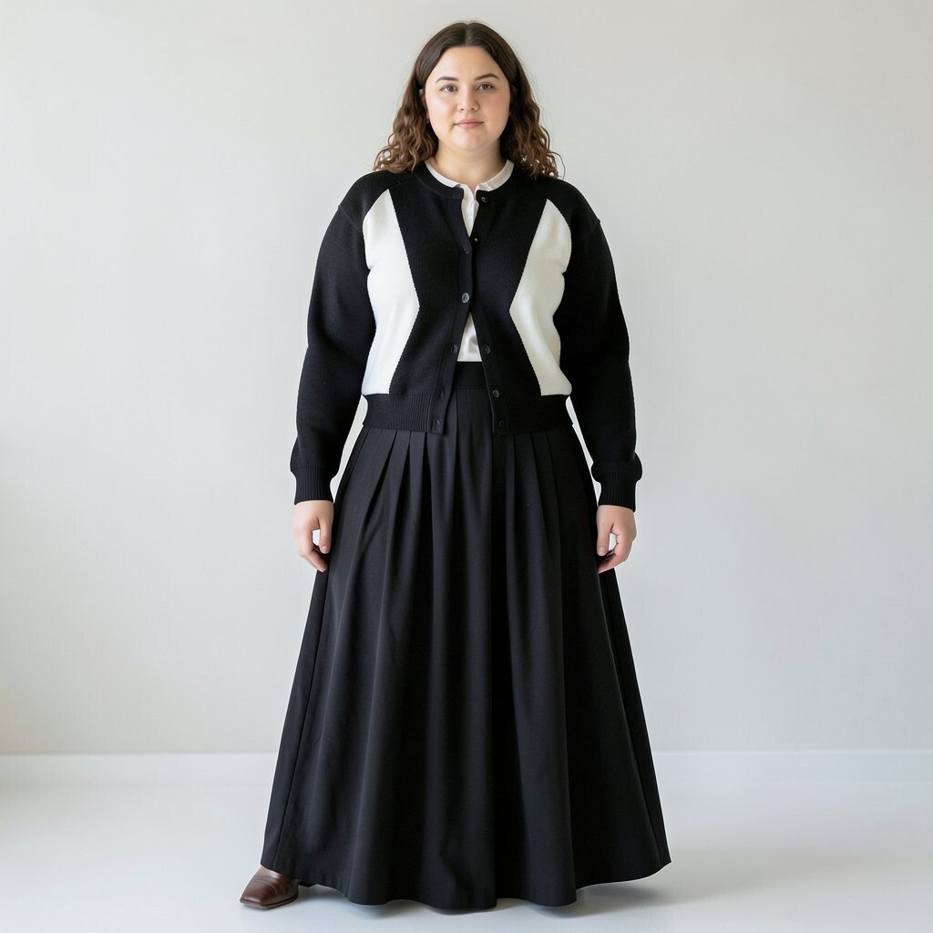 There’s something timeless about black and white. A black maxi skirt paired with a white cardigan is a classic look that never goes out of style. It’s simple, sophisticated, and always in fashion.