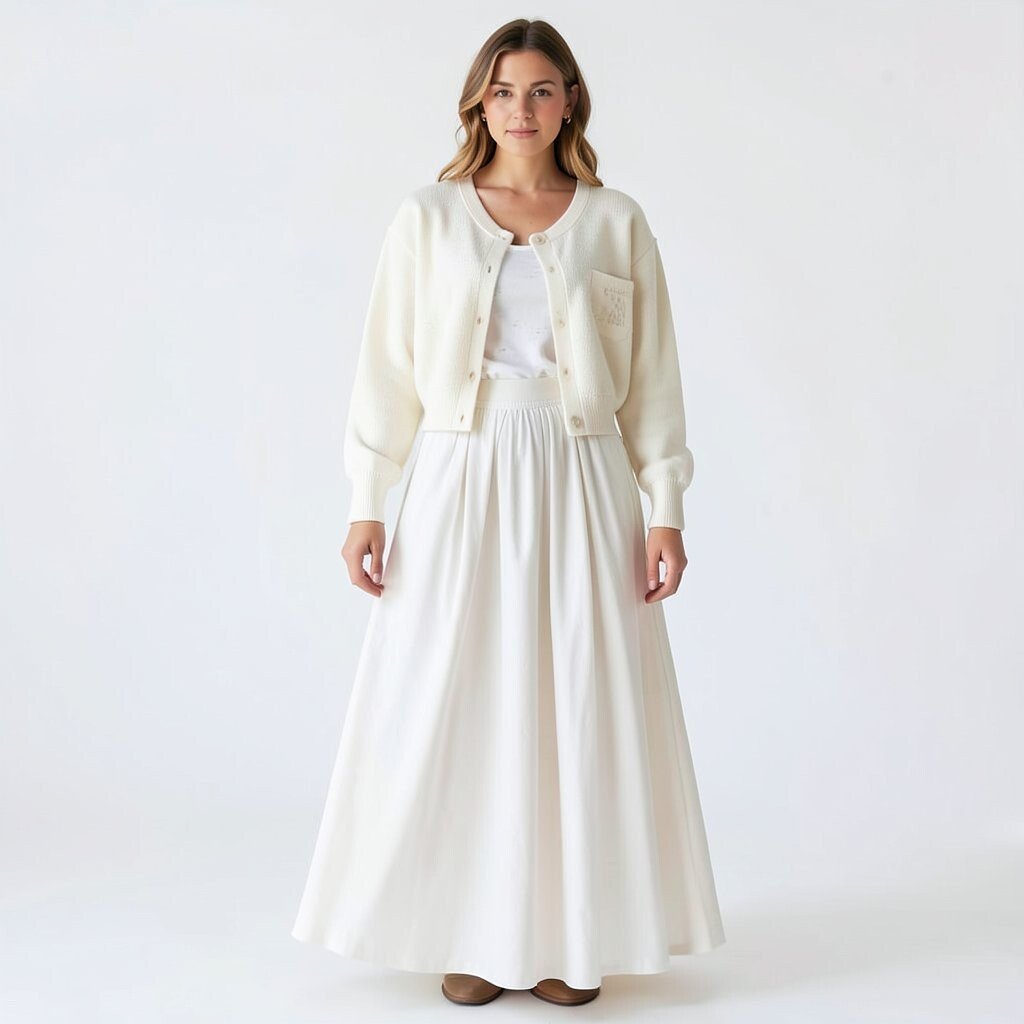 Embrace the freshness of summer with an all-white maxi skirt and cardigan combo. This look is clean, crisp, and perfect for warm days.