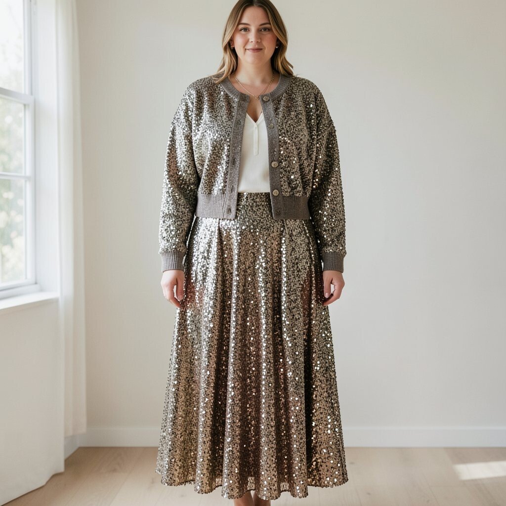 Shine bright with a sequin maxi skirt and a simple cardigan. This look is all about glamour and sparkle.