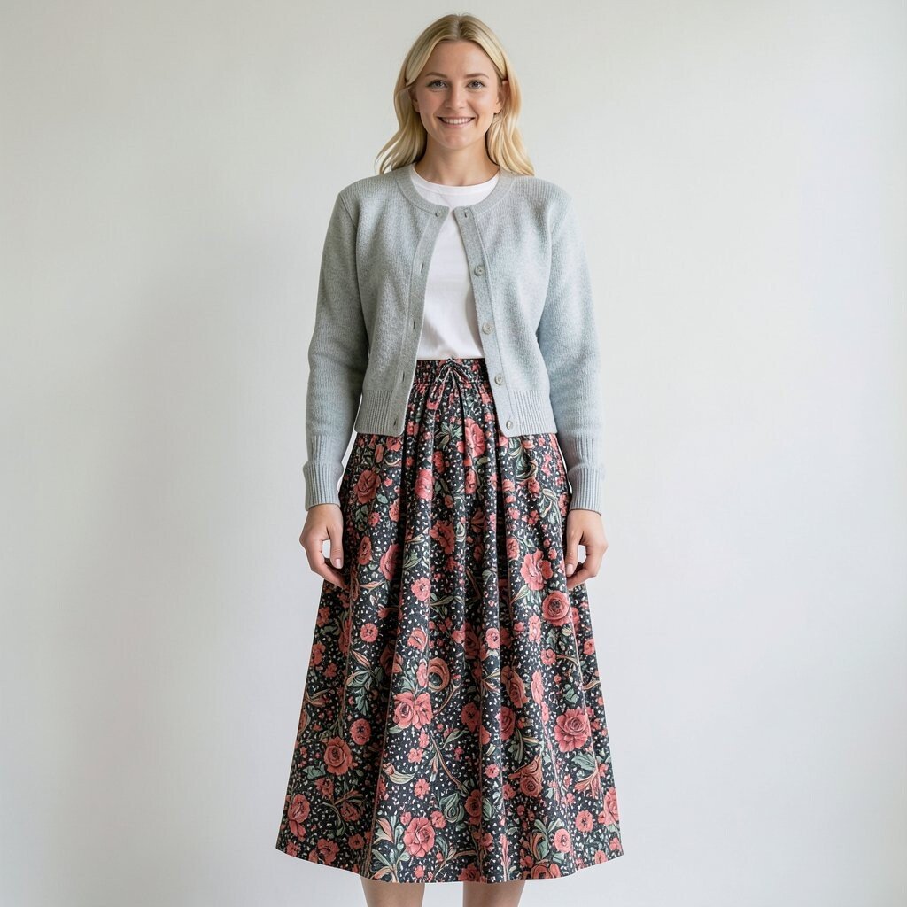 Embrace a vintage look with a retro-patterned maxi skirt and a cardigan with classic details. This look is nostalgic and charming.