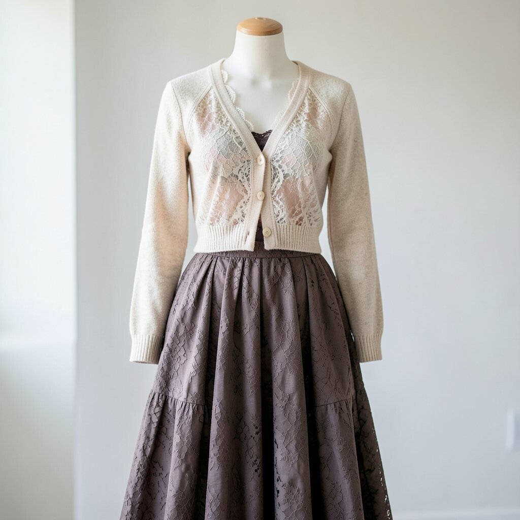 A lace maxi skirt with a matching cardigan creates an enchanting and delicate look. Lace is timeless and adds a touch of romance to any outfit.