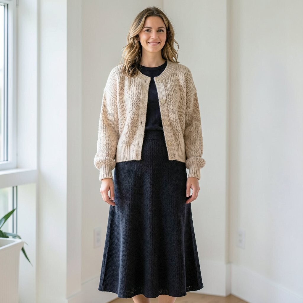 A knit maxi skirt with a matching cardigan is the ultimate in cozy fashion. This outfit is like a warm hug on a chilly day.