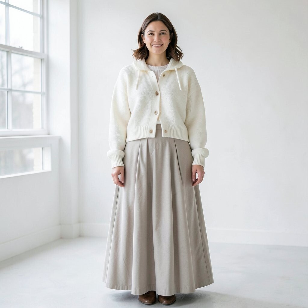 Embrace the elegance of winter with a white maxi skirt and a matching cardigan. This look is sophisticated and fresh.