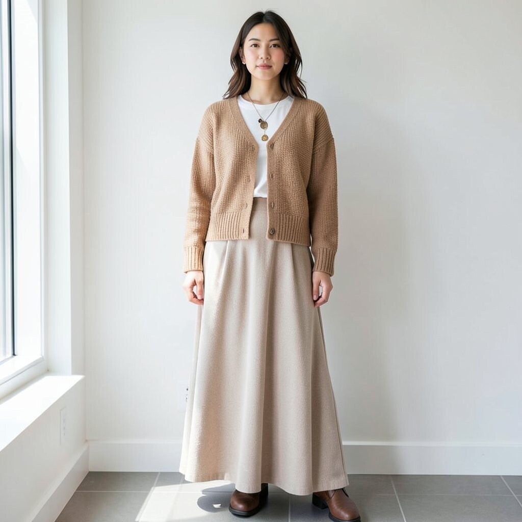 Wrap yourself in warmth with a layered maxi skirt and cardigan look. This outfit is perfect for chilly days when you want to stay cozy.