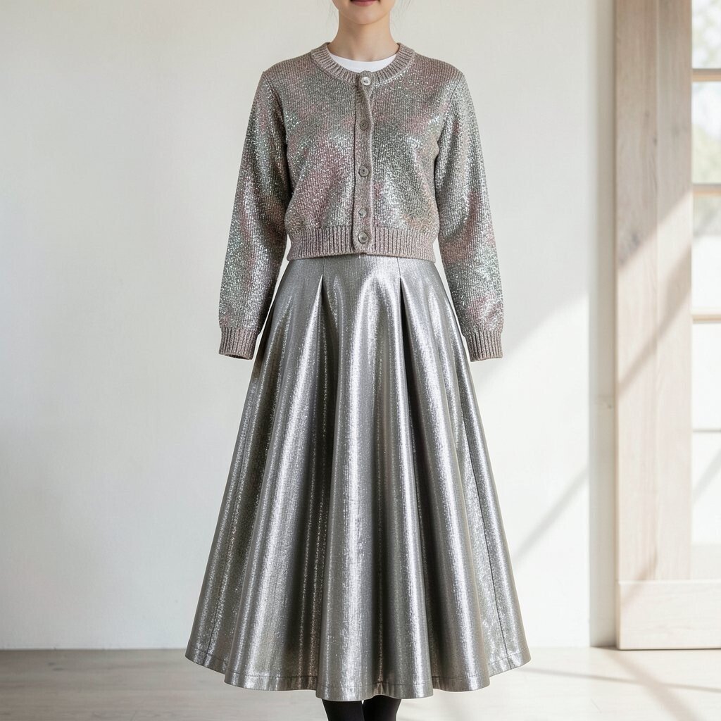 Shine bright in a metallic maxi skirt and a neutral cardigan. This look is bold and glamorous, perfect for when you want to turn heads.