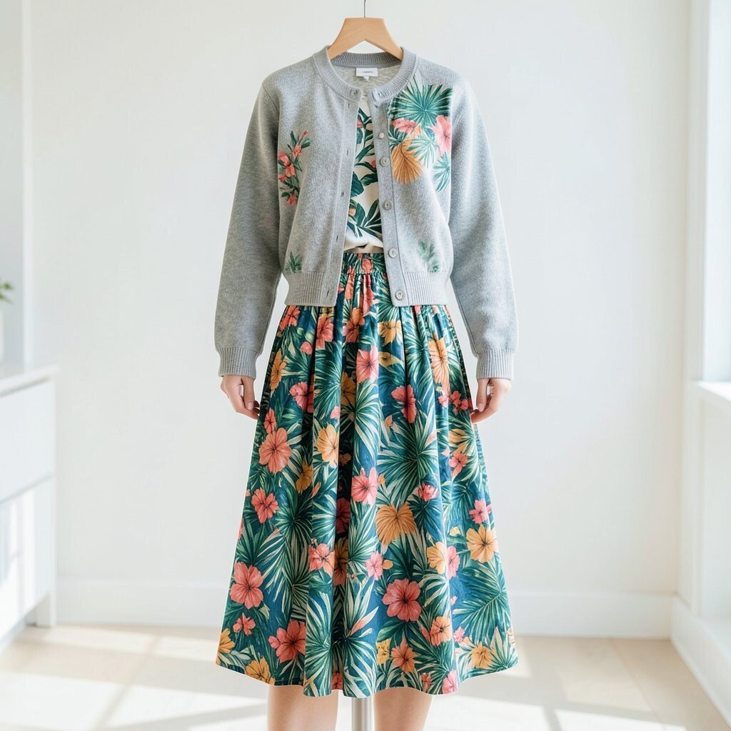 Bring the tropics to your wardrobe with a tropical print maxi skirt and a light cardigan. This look is vibrant, fun, and full of life.