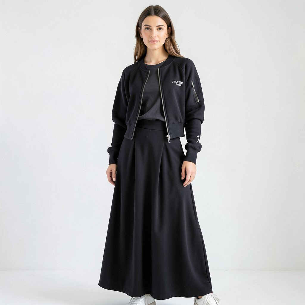 Combine comfort and style with a sporty maxi skirt and a casual cardigan. This look is for those who want to stay active while looking chic.