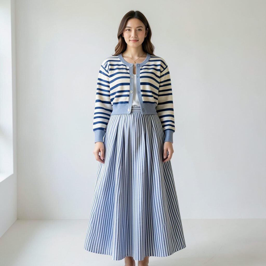Imagine stepping out in a striking striped maxi skirt paired with a soft, neutral cardigan. The bold stripes catch the eye, while the cardigan adds a cozy touch. This combo is perfect for those who love making a statement without going overboard.