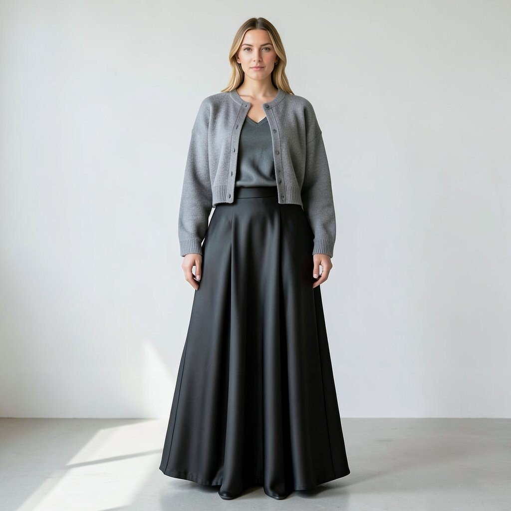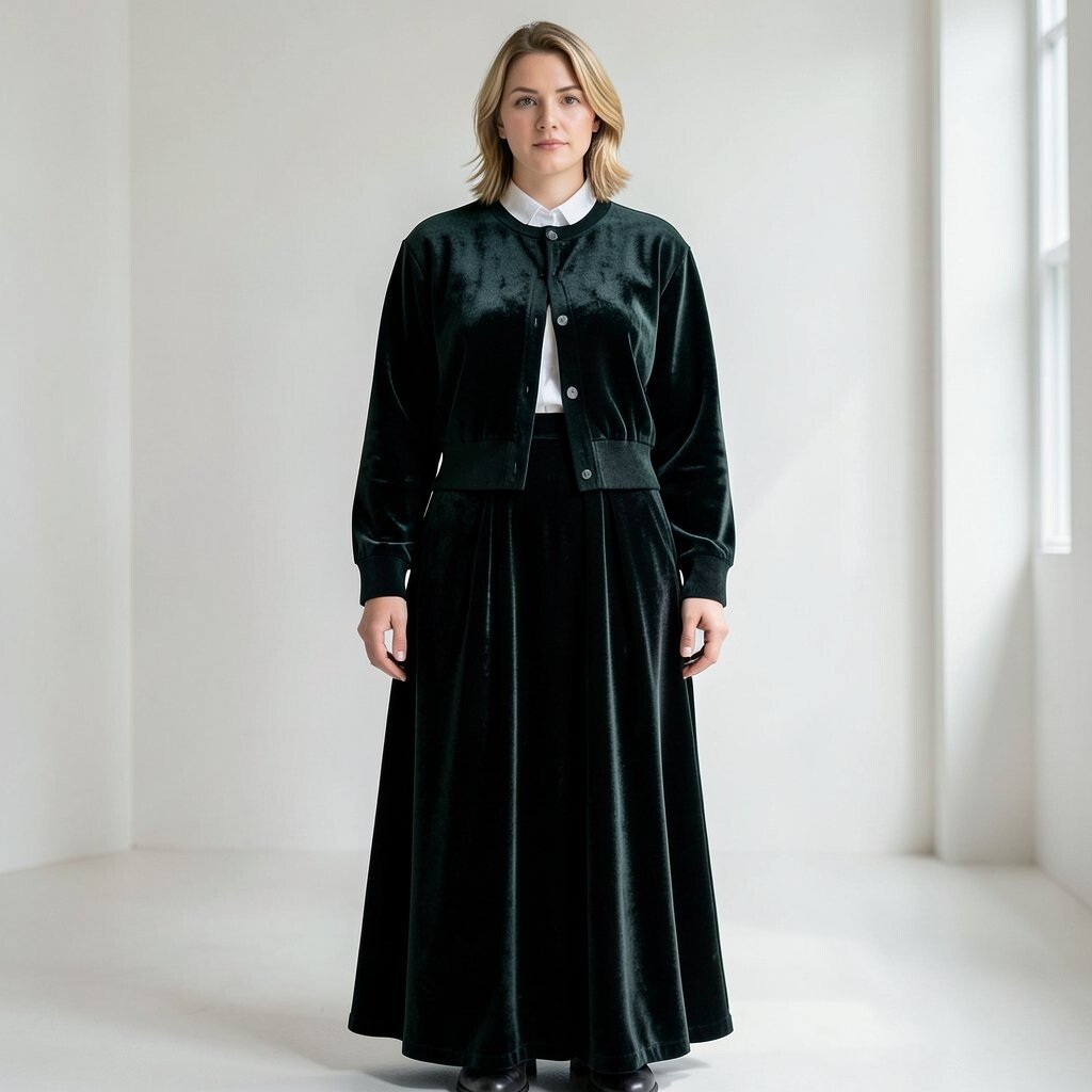 Embrace luxury with a velvet maxi skirt paired with a simple cardigan. Velvet is soft, rich, and perfect for making a statement. This outfit is all about elegance and comfort.
