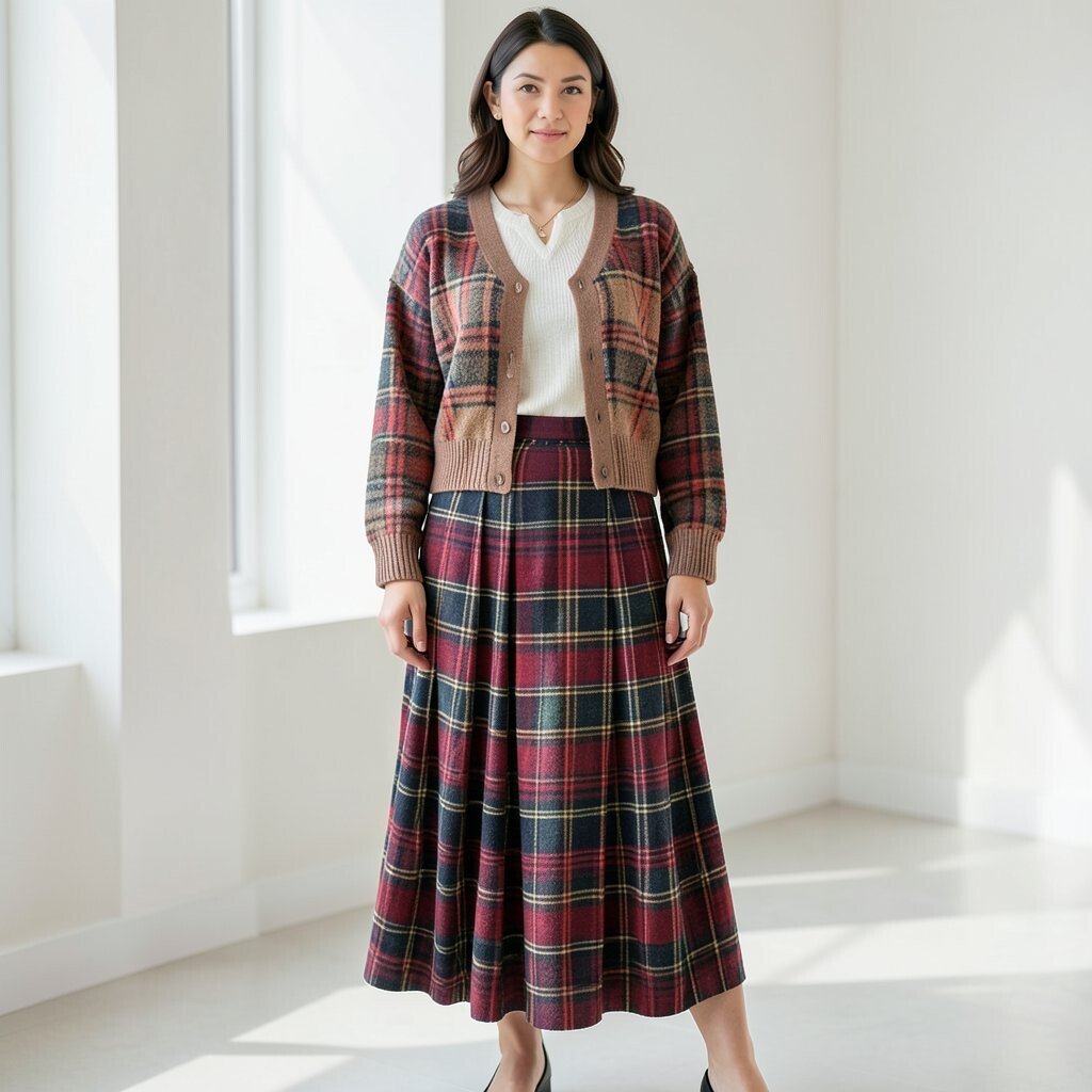 The beauty of plaid is its versatility. You can keep it simple with a plain cardigan or add layers for extra warmth. This outfit suits both fall and winter wardrobes perfectly.
