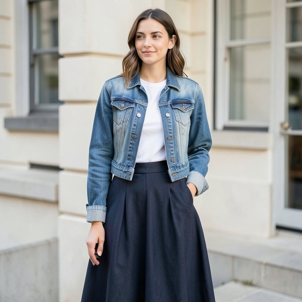 A geometric print maxi skirt with a modern top and a structured denim jacket creates an avant-garde look. The geometric print is bold and contemporary, while the structured jacket adds a modern edge. It’s a look for the fashion-forward thinker.