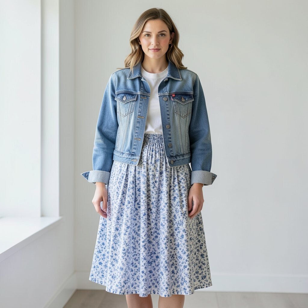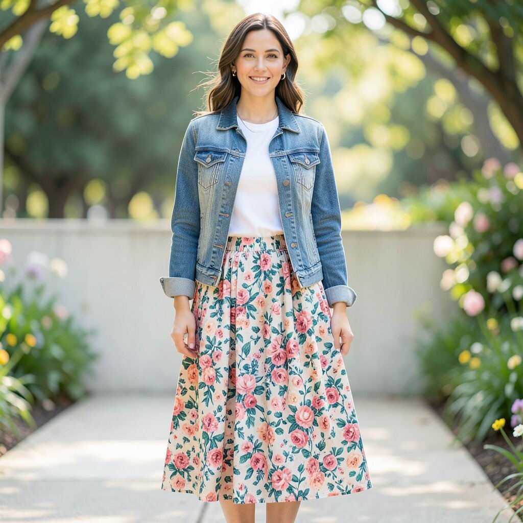 A floral print maxi skirt with a romantic top and a denim jacket creates a dreamy look. The florals add charm, while the denim jacket keeps it grounded. It’s a floral fantasy that enchants the senses.
