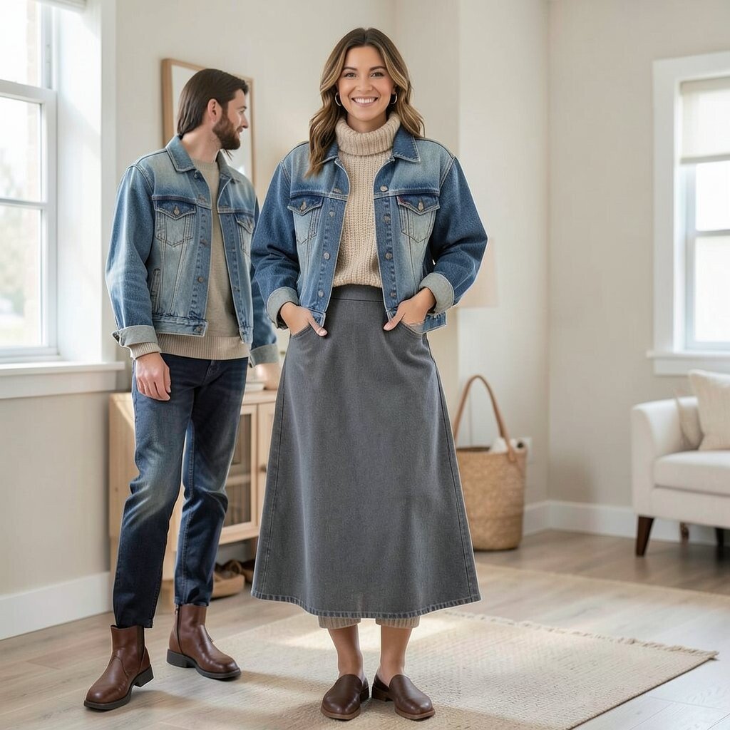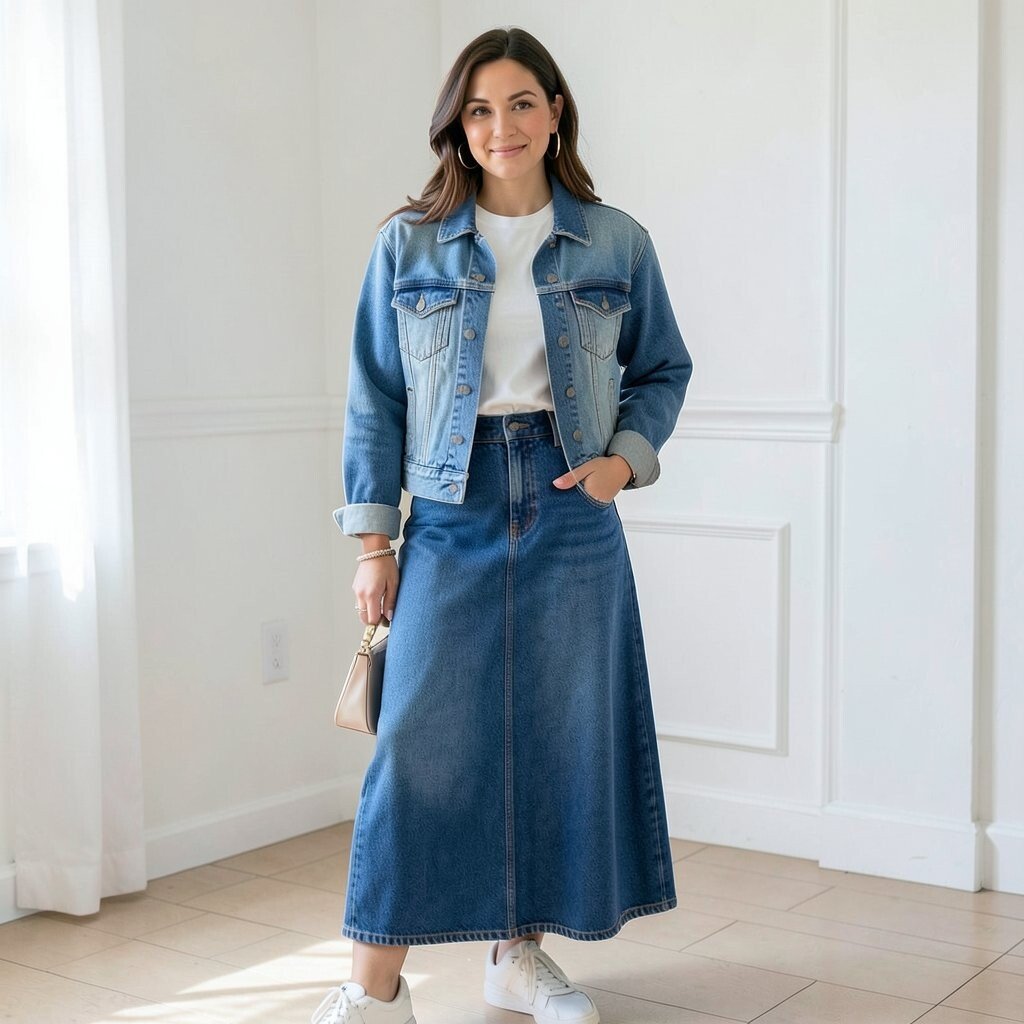 A knit maxi skirt with a cozy sweater and a denim jacket is perfect for cooler days. The knit adds warmth, while the denim jacket provides structure. It’s a layered look that’s both comfy and stylish.