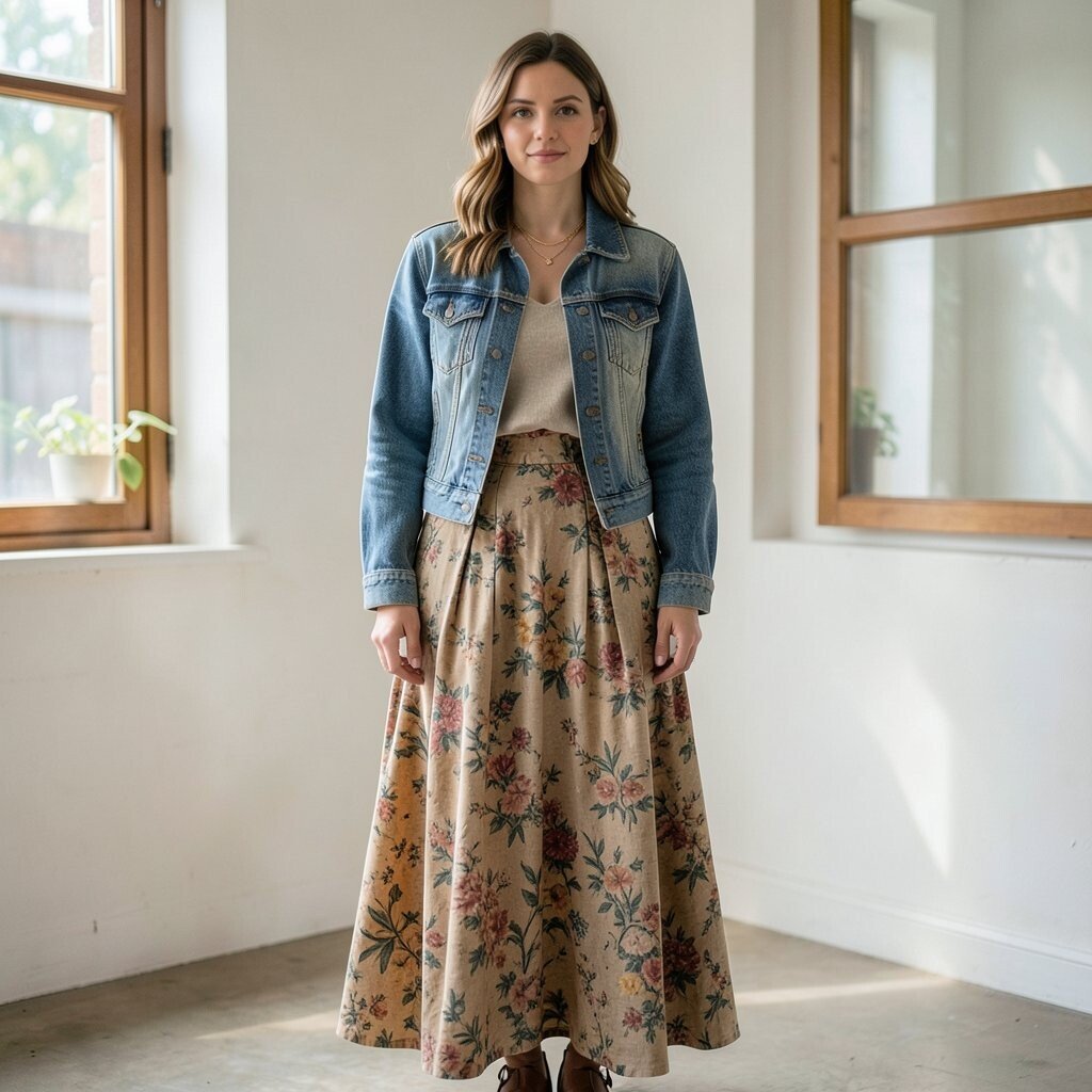 Picture a flowy floral maxi skirt paired with a slightly distressed denim jacket. This look is all about channeling your inner bohemian spirit. The soft florals contrast beautifully with the rugged denim, creating a harmonious balance.