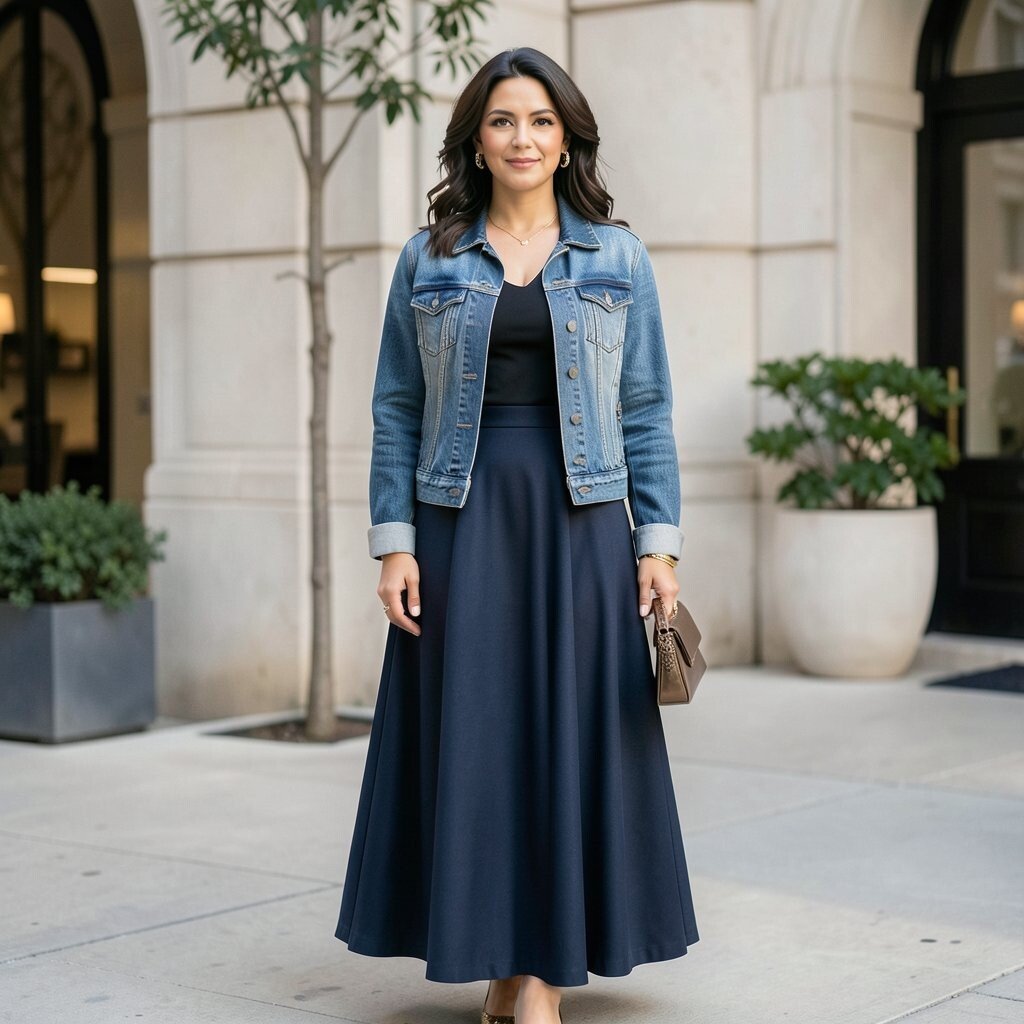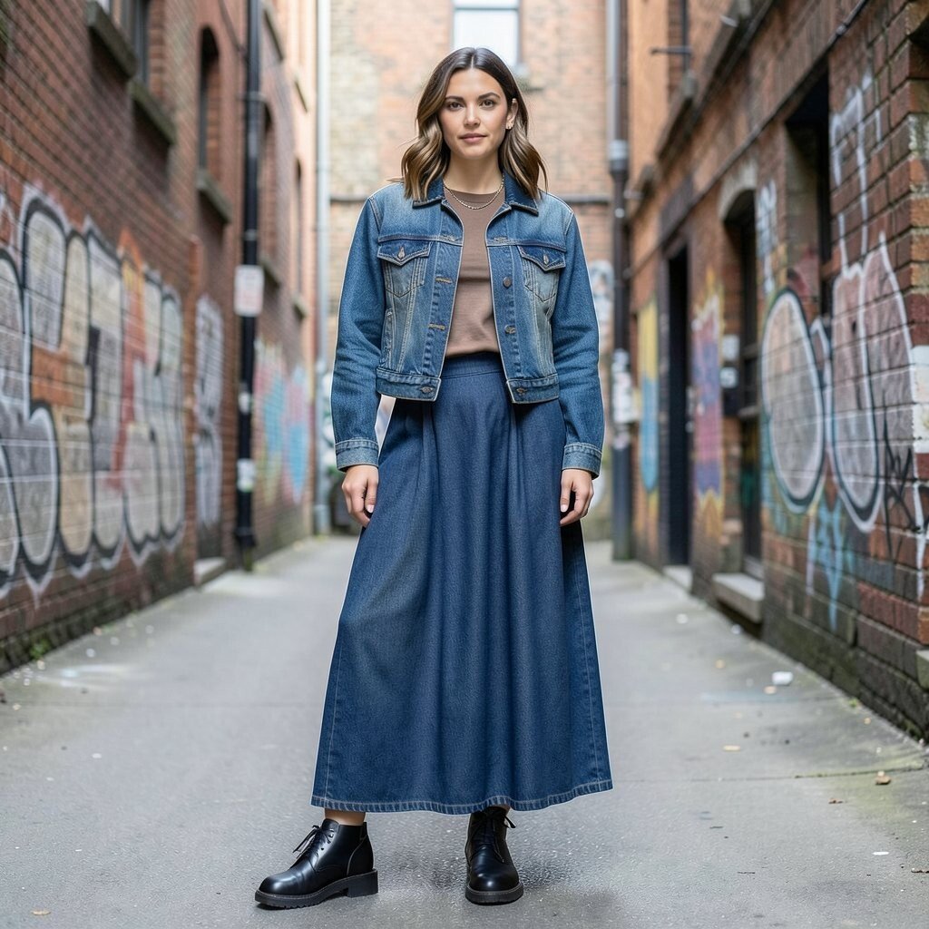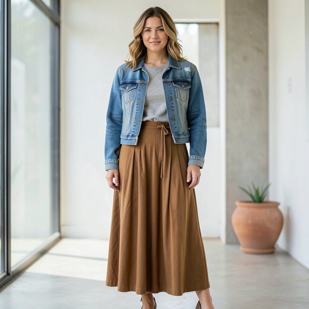 Try a brown or olive maxi skirt with a beige top and a dark denim jacket. The earthy tones create a warm, inviting look that’s perfect for fall. It’s a cozy combination that’s both stylish and comfortable.